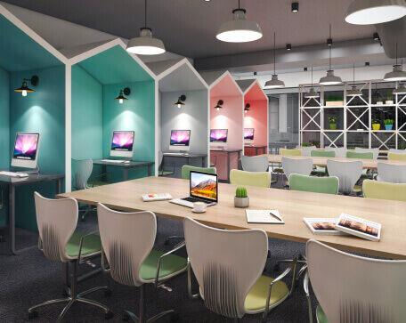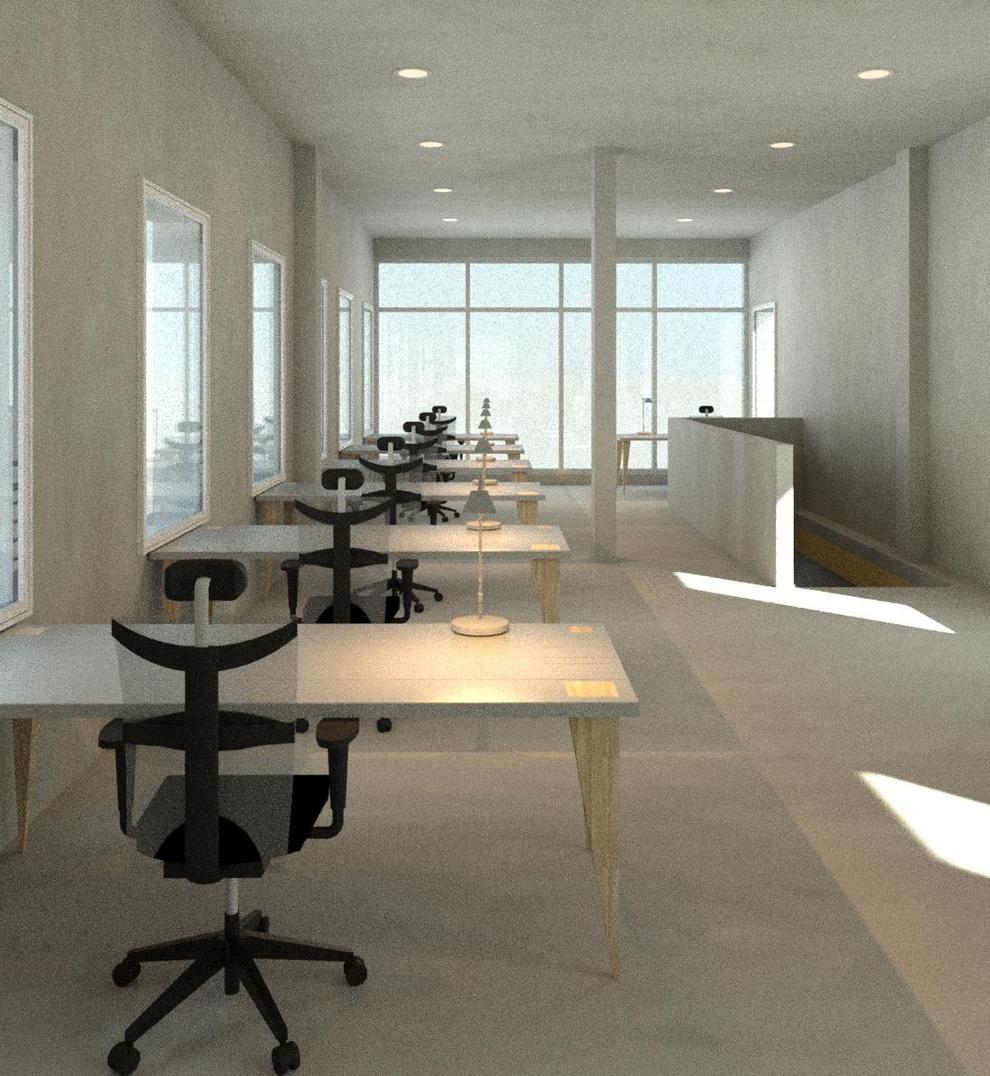 All desks located beside a window, with the front right desks along the glasscurtainwall.