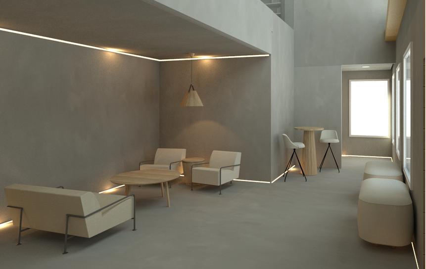 Different seating options for students, customers, designers, etc. can work at, lounge or study the fashion designers working through the cut out ceiling.
