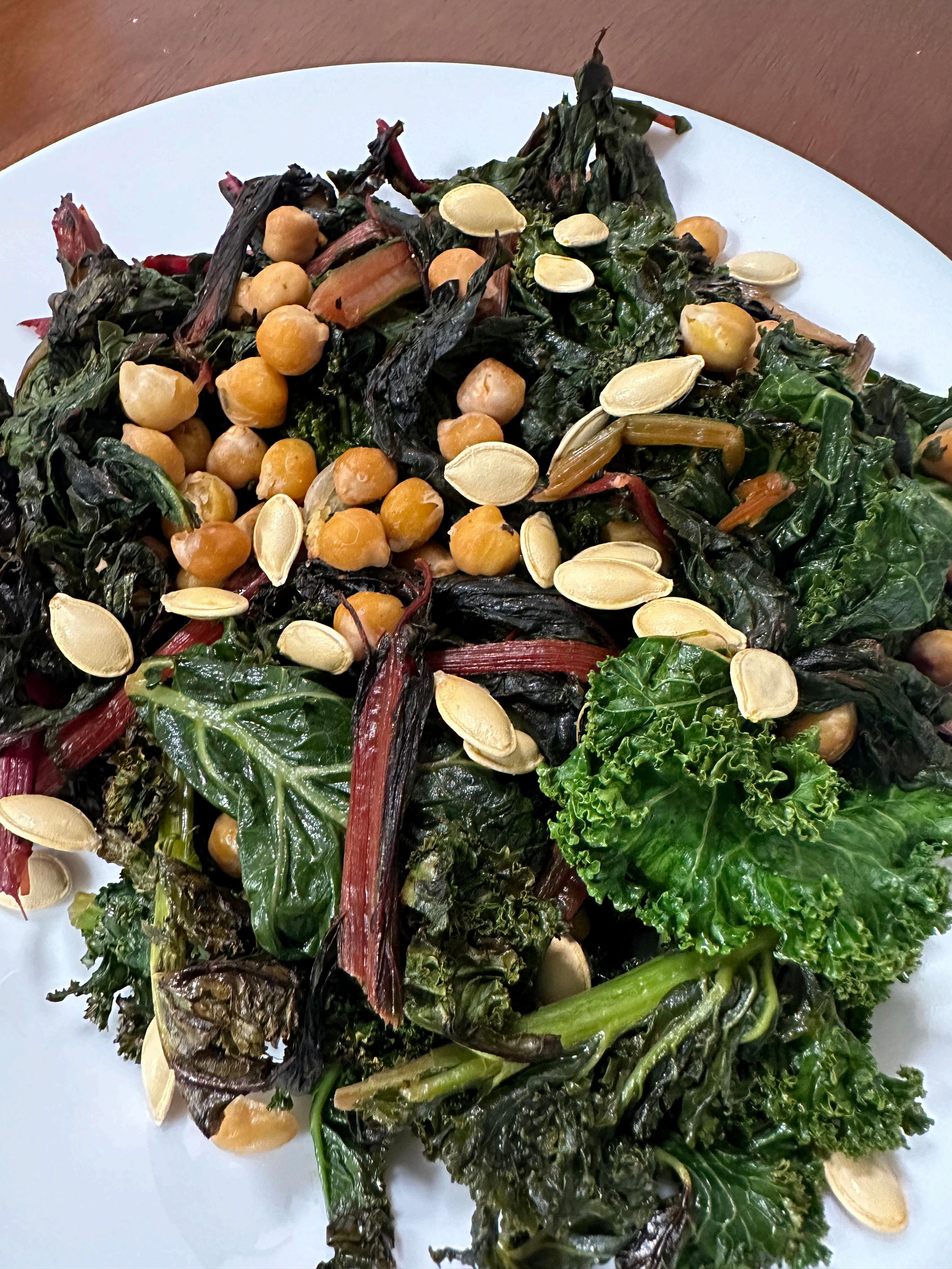Season with salt and freshly ground black pepper to taste. Once the greens are cooked, transfer them to a serving dish and top with the roasted chickpeas.