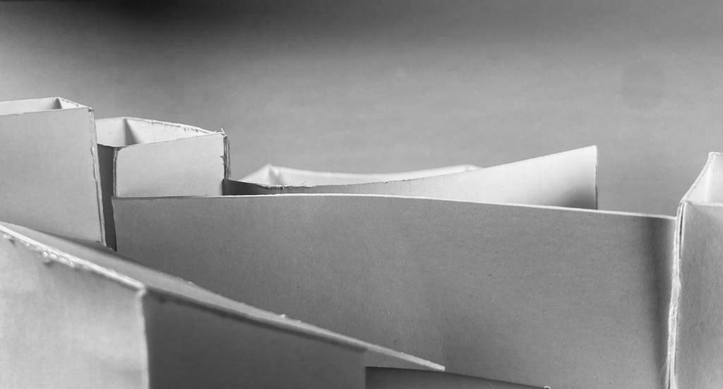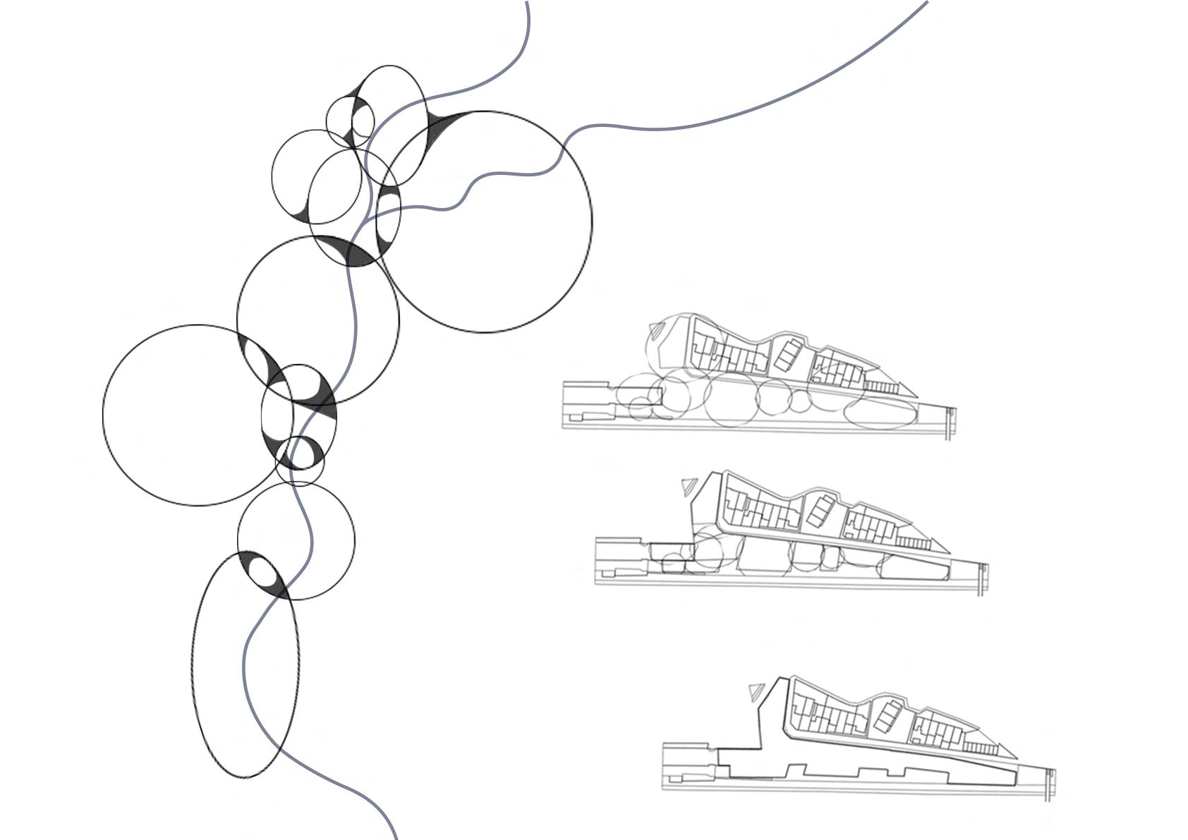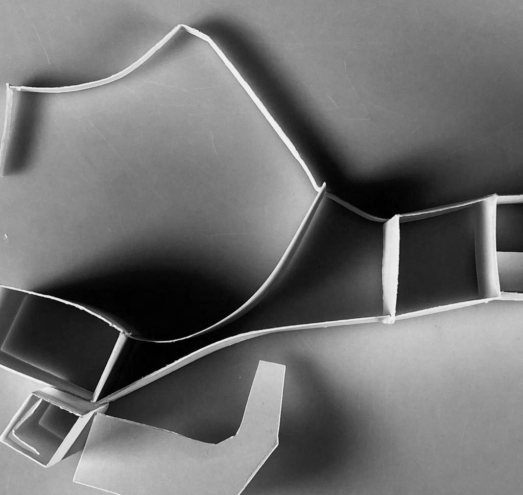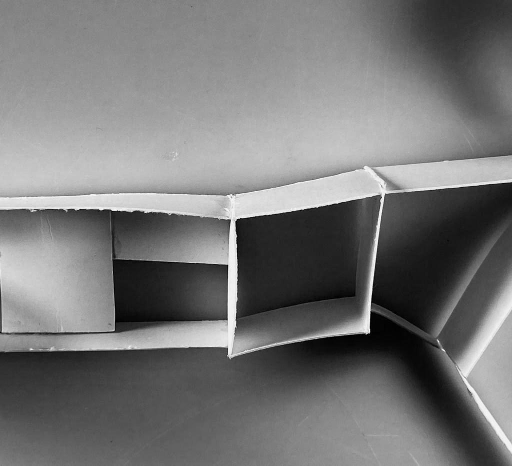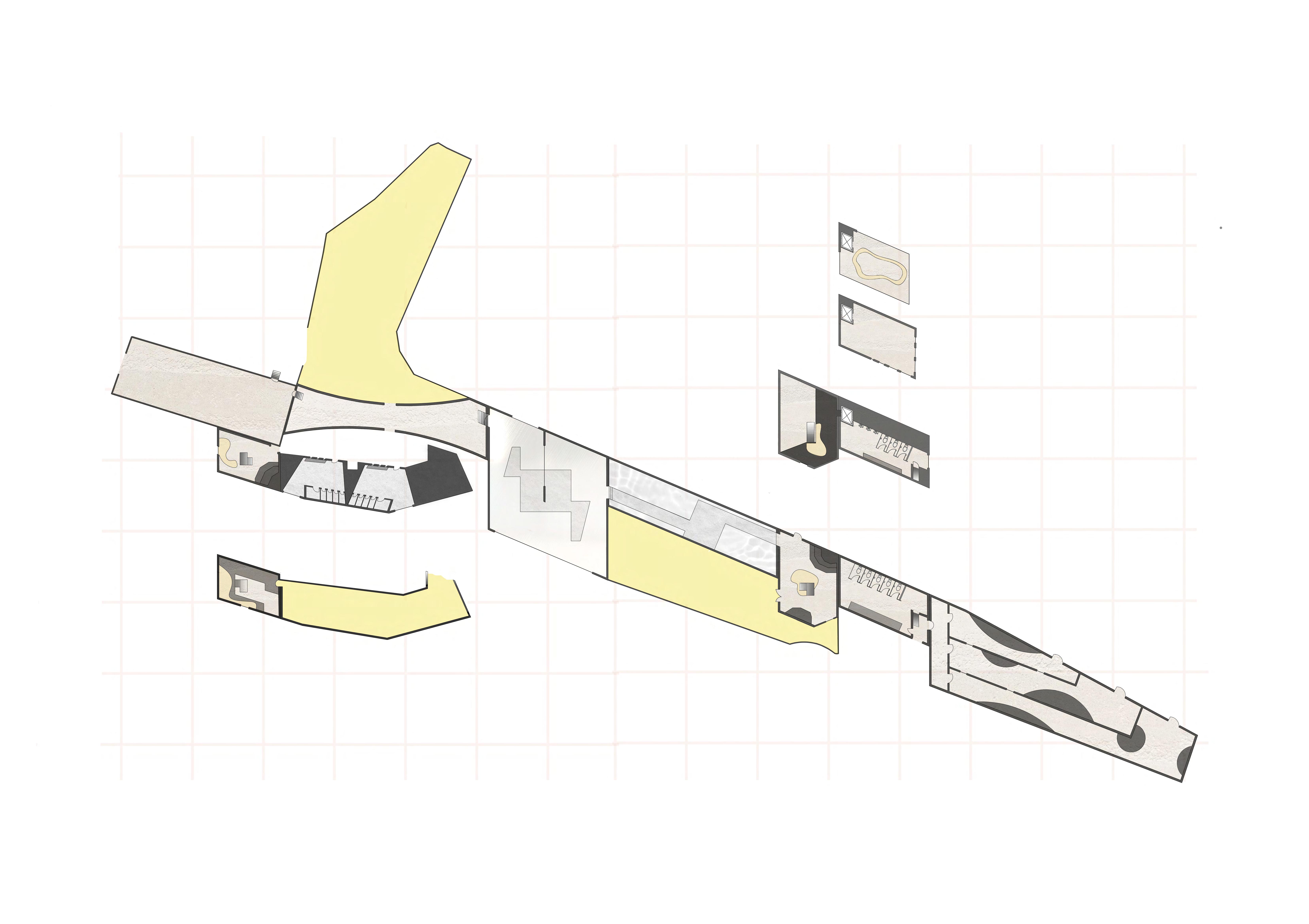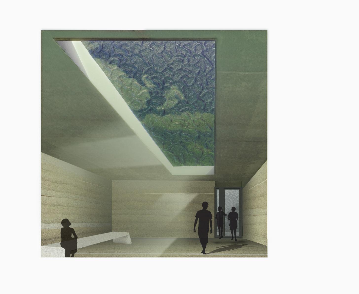 THE CUREVED WALKWAY STRUCTURE ACTS AS A CONNECTION BETWEEN THE SHED AND ETHER. AS ONE OF THE ENTERENCES, THE WALKWAY CONNECTS MULTIPLE SPACES WITHIN ETHER WITHOUT LOSING THE DISTICT FEATURE OF THE SKYLIGHTS EXTHEDED FRON THE SHED.