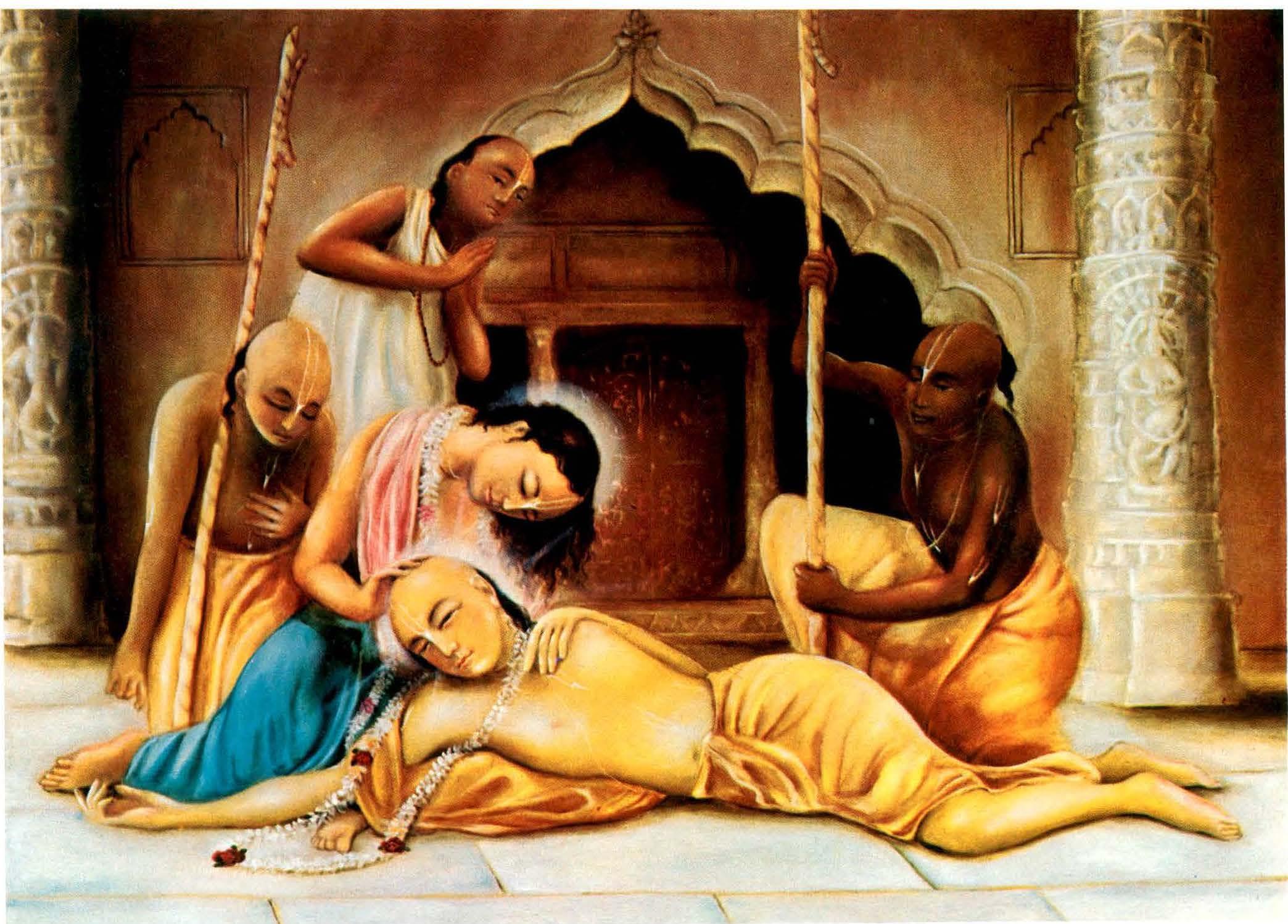 When Sri Caitanya Mahaprabhu recited this verse, Heimmediately fell to the ground unconscious. He was overwhelmed and had no control over Himself. When Lord Sri Caitanya Mahaprabhu fell to the ground in ecstatic love, Lord Nityananda took Him on His lap. Crying, Caitanya Mahaprabhu then got up again."