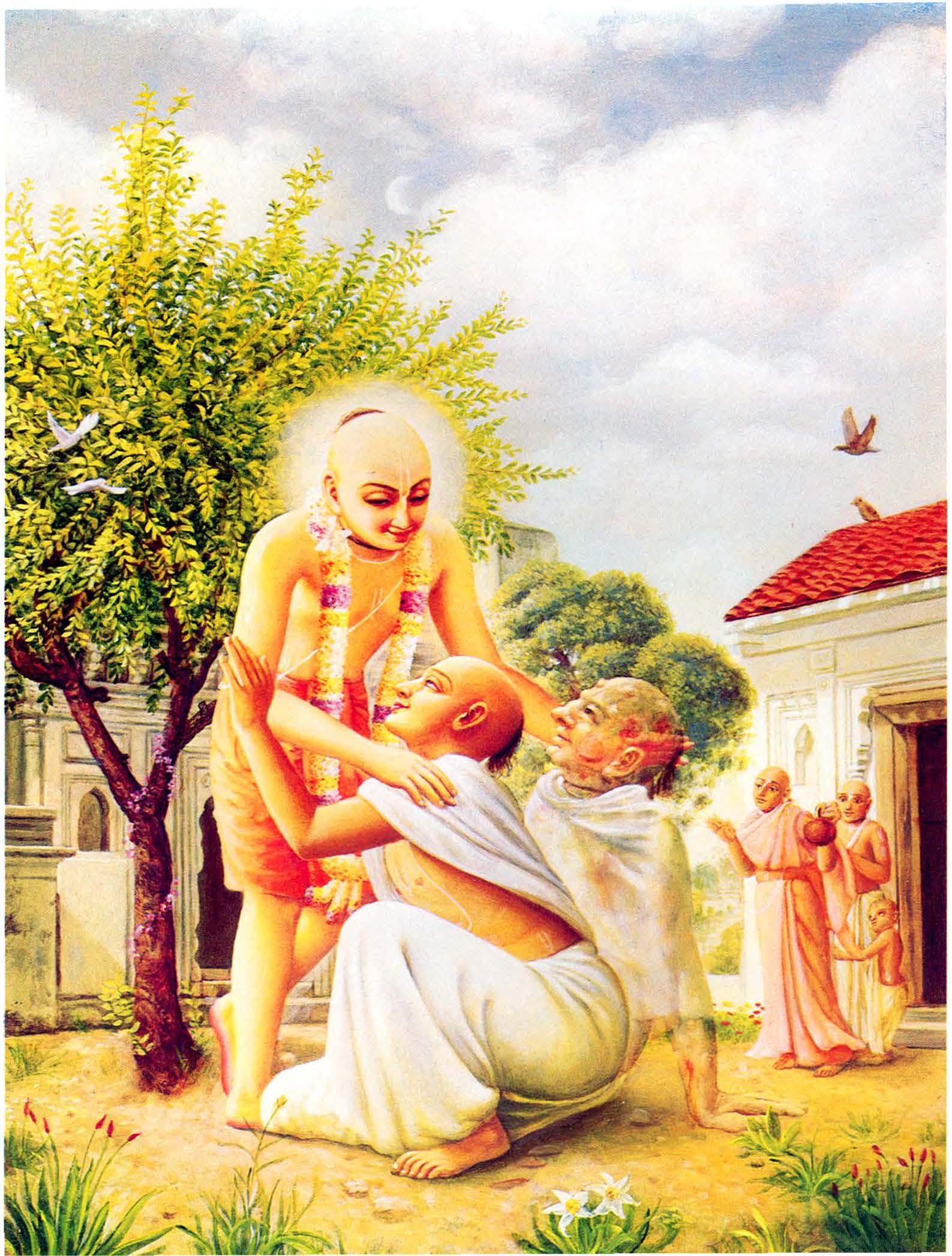 "Sri Caitanya Mahaprabhu could understand thatthe person who had come to bathe in the river was Ramananda Raya. The Lord wanted so much to meet him that His mind immediately began running after him. AlthoughSri Caitanya Mahaprabhu wasrunningafter him mentally, He patiently remained sitting. Ramananda Raya, seeing the wonderful sannyasi, then came to see Him. Srila Ramananda Raya then saw Sri Caitanya Mahaprabhu as brilliant as a hundred suns. The Lord was covered by a saffron garment. He was large in body and very strongly built, and His eyes were like lotus petals. Sri Caitanya Mahaprabhu then embraced Sri Ramananda Raya very firmly. Indeed, both the master and the servant almost lost consciousness due to ecstatic love." (pp. 88-91)