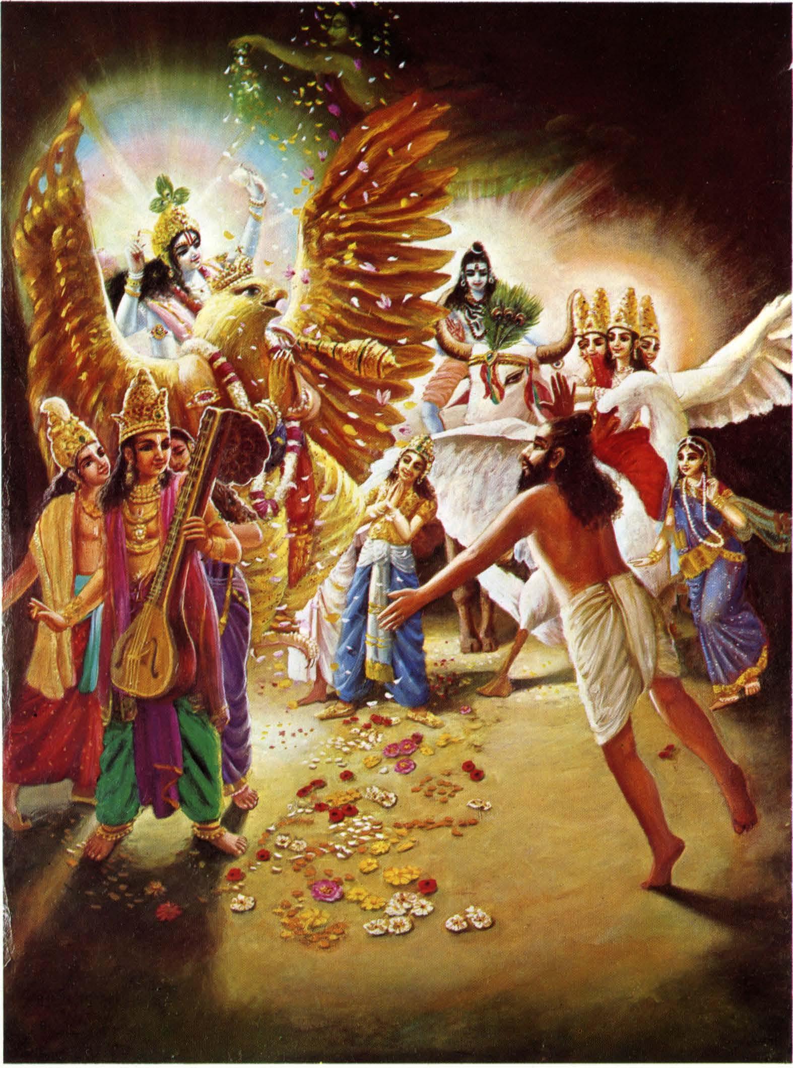 The three deities approached the hermitage of Atri Muni, accompanied by the denizens of the heavenly planets. (page 19)
