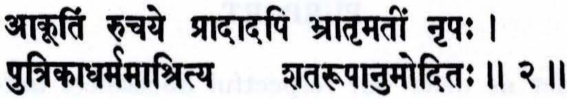 In this Fourth Canto of Srimad-Bhiigavatam there are thirty-one chapters,and all these chapters describe the secondary creation by Brahma and the Manus. The real creation is done by the Supreme Lord Himself by agitating His material energy, and then, by His order, Brahma, the first living creature in the universe, attempts to create the different planetary systems and their inhabitants,expanding the population through his progeny, like Manu and other progenitors of living entities, who work perpetually under the order of the Supreme Lord. In the First Chapter of this Fourth Canto there are descriptions of the three daughters of Svayambhuva Manu and their descendants. The next six chapters describe the sacrifice performed by King Dak�a and how it was spoiled. Thereafter the activities of Maharaja Dhruva are described in five chapters. Then, in eleven chapters, the activities of King Prthu are described, and th� next eight chapters are devoted to the activities of the Pracetas J5.ih.gs. Asdescribed in the first verse of this chapter, Svayambhuva Manu had three daughters,named Akuti, Devahiiti andPrasuti..Ofthesethree daughters, one daughter, Devahuti, has already been described, along with her husband, Kardama Muni, and her son, Kapila Muni. In this chapter the descendants of the first daughter, Akuti, will specifically be described. Svayambhuva Manu is the son of Brahma. Brahma had many other sons, but Manu's name is specifically mentioned first because he was a great devotee of the Lord. In this verse there is also the word ca, indicating that besides the three daughters mentioned, Svayambhuva Manu also had two sons.