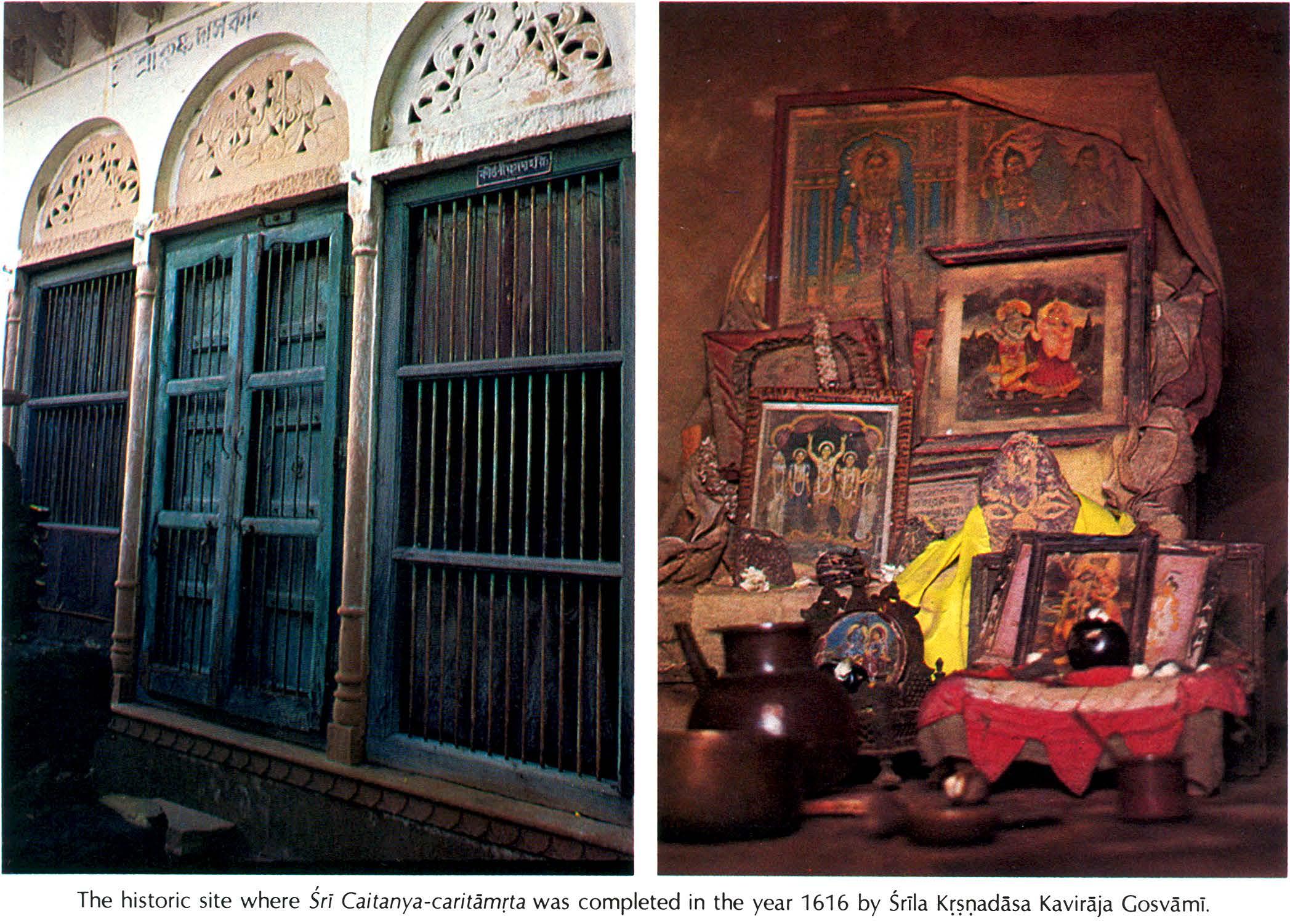 The author of this great classic, Kr�t:�adasa Kaviraja Gosvami, born in the year 1507, was a disciple of Raghunatha dasa Gosvami, a confidential follower of Caitanya Mahaprabhu. Raghunatha dasa, a renowned ascetic saint, heard and memorized all the activities of Caitanya Mahaprabhu told to him by SvarOpa Damodara. After the passing away of SrT Caitanya and SvarOpa Damodara, Raghunatha dasa, unable to bear the pain of separation from these objects of his completedevotion, traveled to Vrndavana, intending to commit suicide by jumping from Govardhana Hill. In Vrndavana, however, he encountered ROpa Gosvami and Sanatana Gosvami, the most confidential disciples of Caitanya Mahaprabhu. They convinced him to give up his plan of suicide and impelled him to reveal to them the spiritually inspiring events of Lord Caitanya's later life. Kr�t:�adasa Kaviraja Gosvami was also residing in Vrndavana at this time, and Raghunatha dasa Gosvami endowed him with a full comprehension of the transcendental life of Sri Caitanya