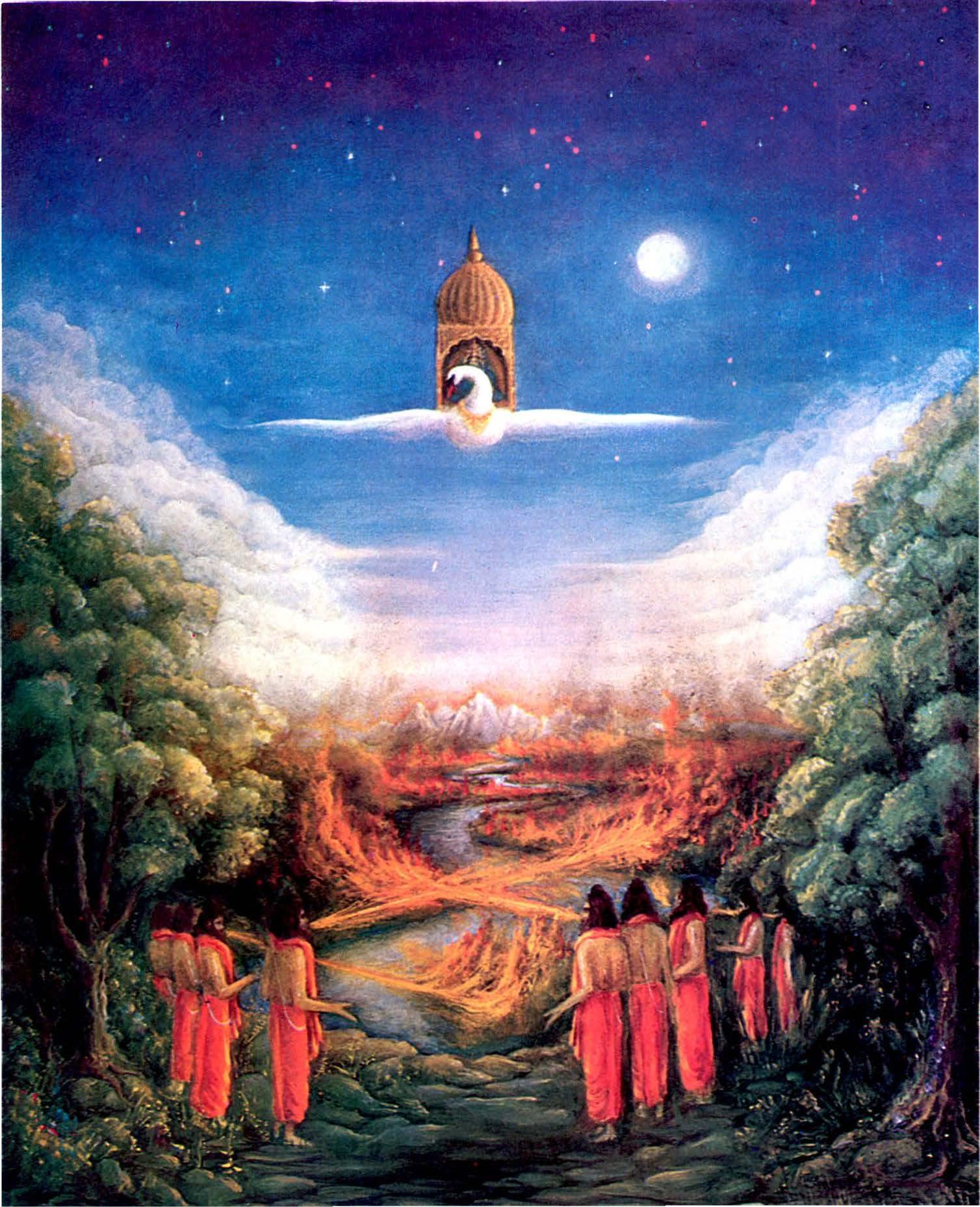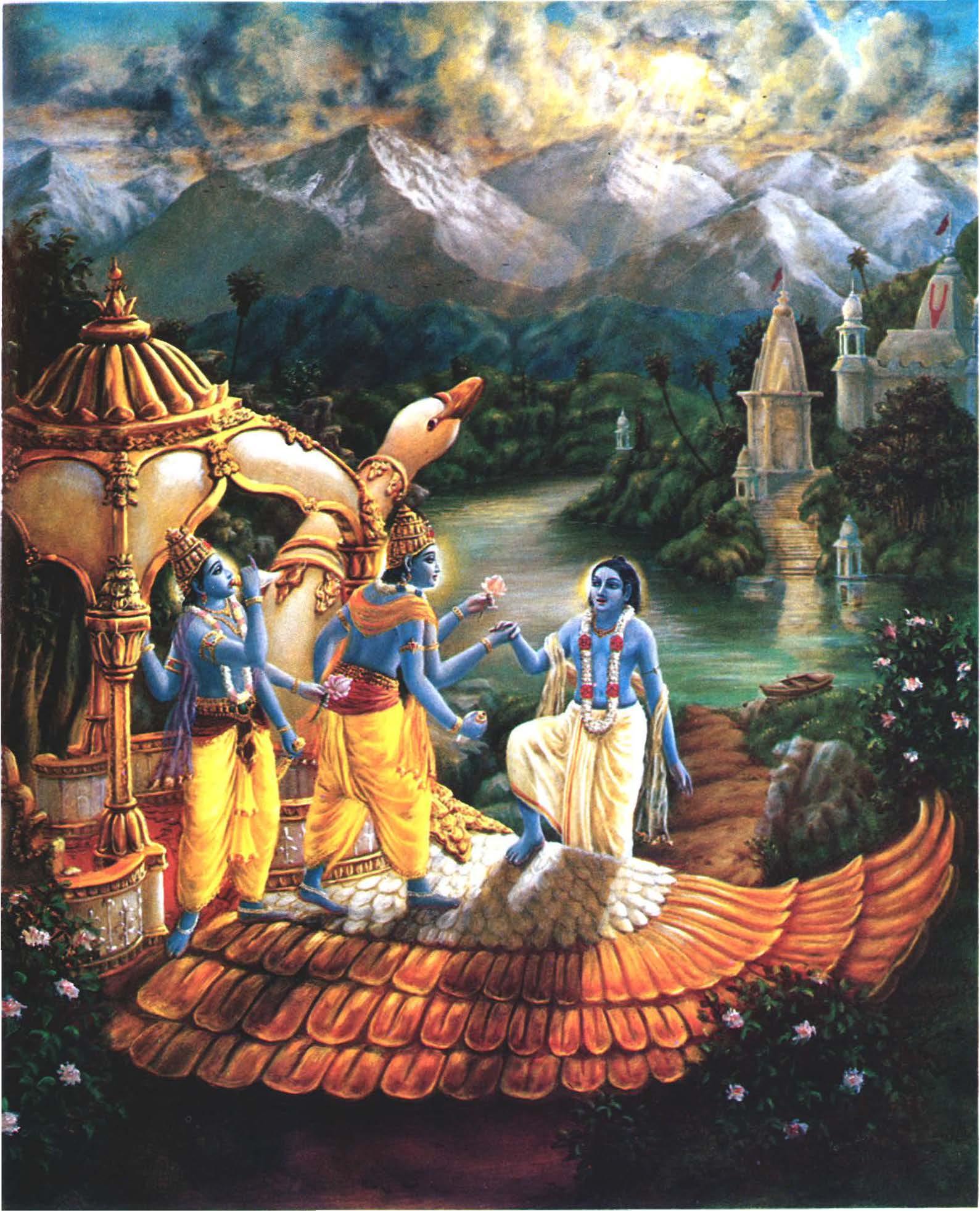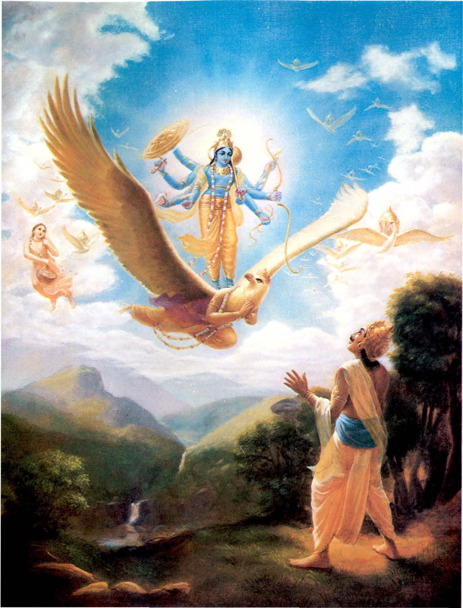 "After regretting his past sinful activities, Ajamila freed himself from all material attraction and took shelter at a Vi�QU temple in Hardwar, where he executed the process of bhakti-yoga. Thus he detached his mind from the process of sense gratification and became fully absorbed in thinking of the form of the Lord. When his intelligence and mind were fixed upon the form of the Lord, the brtihmar.ta Ajamila once again saw before him four celestial persons. Upon seeing the Vi�Qudiitas, Ajamila gave up his material body at Hardwar on the bank of the Ganges. He regained his original spiritual body, which was a body appropriate for an associate of the Lord. Accompanied by the order carriers of Lord Vi�Qu, Ajamila boarded an airplane made of gold. Passing through the airways he went directly to the abode of Lord Vi�QU, the husband of the goddess of fortune." (pp.128-133)