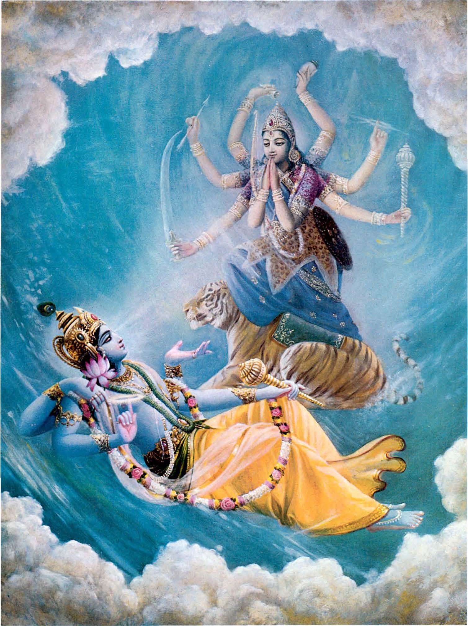 "The Supreme Personality of Godhead is beyond the creation of this material world, for He is the source of the material qualities and creation." (p.221) In the beginning of the creation, the Lord expands Himself in the form of the puru�a incarnation, Maha-Vi�l)u. Lying in the Causal Ocean, the Supreme Personality of Godhead glances over His unmanifest material energy (shown here as Durga, the personification of material nature). At that time the living entities, who are His parts and parcels, are impregnated into material nature.