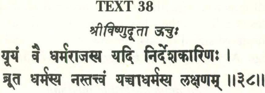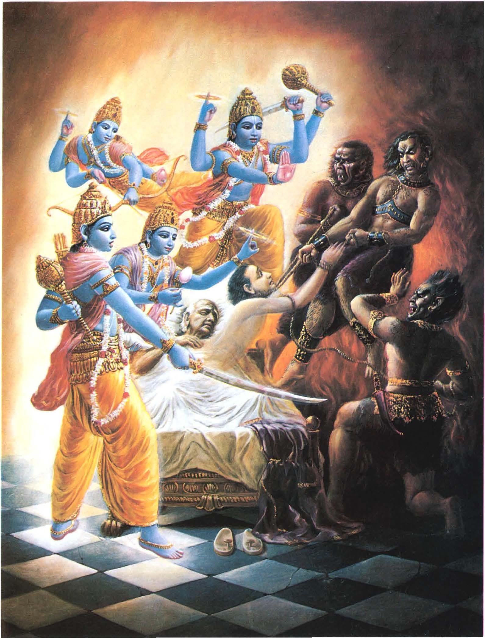 "At the time of his death the sinful Ajamila saw three awkward persons with deformed bodily features, fierce, twisted faces, and hair standing erect on their bodies. With ropes in their hands, they had come to take him away to the abode of Yamaraja. When he saw them he was extremely bewildered, and because of attachment to his child, Narayal)a, who was playing a short distance away, Ajamila began to call him loudly by his name. Thus with tears in his eyes he somehow or other chanted the holy name of Narayal)a. The order carriers of Vi�l)u, the Vi�l)udiitas, immediately arrived when they heard the holy name of their master from the mouth of the dying Ajamila. The order carriers of Yamaraja were snatching the soul from the core of the heart of Ajamila, the husband of the prostitute, but with resounding voices the messengers of Lord Vi�l)u, the Vi�l)udiitas, forbade them to do so." (pp.42-46)