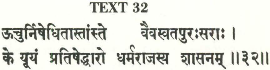When the Yamadutas were baffled and defeated by the order carriers of Vi��u, they approached their master, Yamaraja, the supreme judge of all sinful persons, to tell him of this incident. Almost in anger, they questioned whether there were many authorities other than him. Yamaraja then explained the position of the supreme controller of the entire world, Lord Sri Kr��a, the Personality of Godhead, and the glories of chanting the holy name of the Lord. (p.144)
