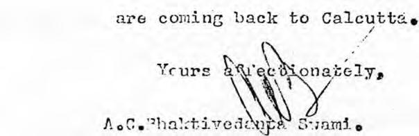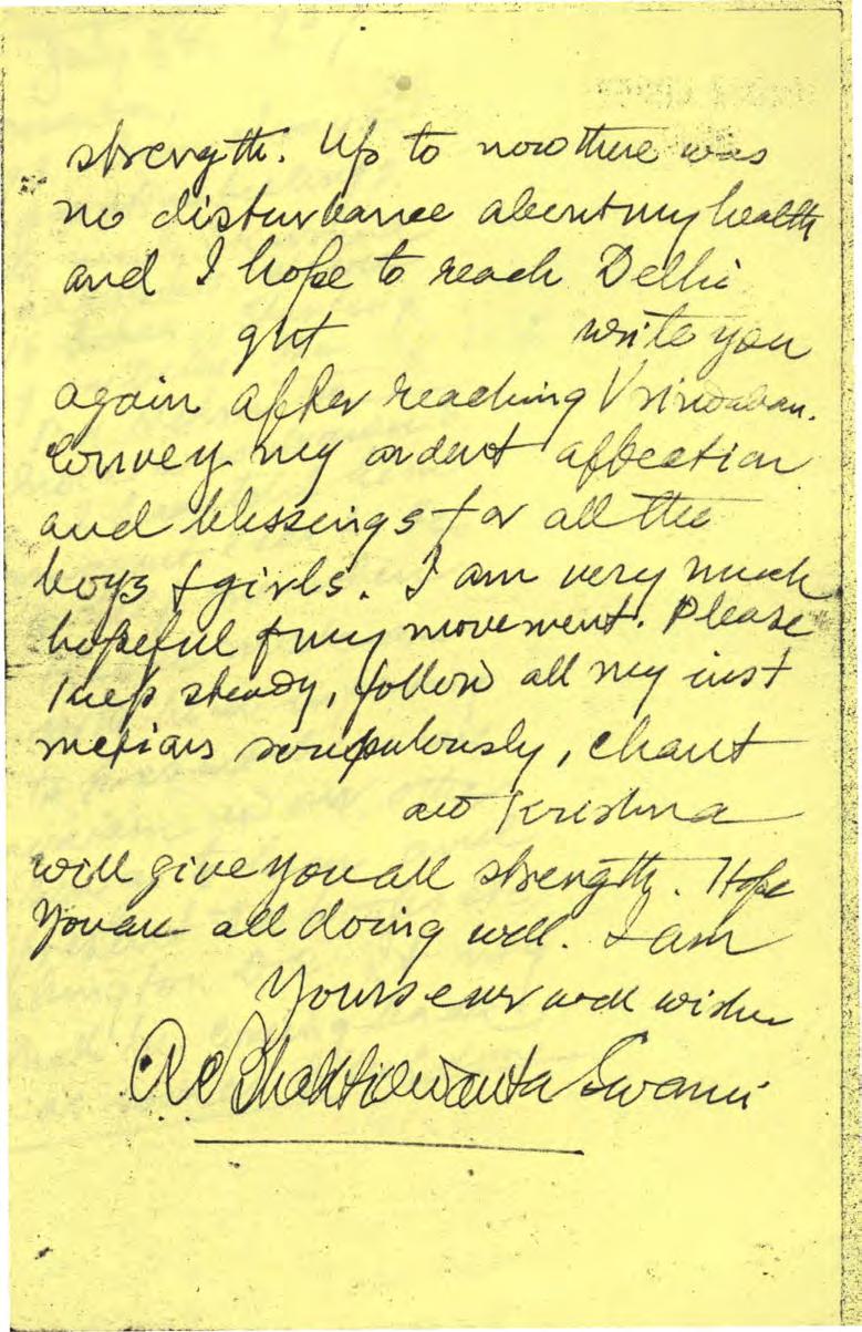 l'lcn�c ucccpt my blessingsa lam always thinking of you, and 1 "�' feeling separation. I wish to return ot ttH� ccn•liest op1 ortunity. I cannot stop my ·,estern world activities und 1 ha\'c tohen le�JVC from you for only six mont!4s; and it mfly be thnt on or ucfore 1 will come to you u.t;uin. So continue your nc t 1 ,. 1 t 1.cs w ith �r cu t vigo r. I sh a 11 ulways pray to K ri sunu for yo\lr !:§tcady udvance, but try to follow the principles which _arc nC'ccs:--nry to strengthen ones self in the matter of spiritual (u.h·�· nc'-·. f\cv�!' _�h�J!.k _ _!.�.9��m a bsent from you� 1·11ysi co 1 prescuce-ts not cssentiol; presence by messa�e (or !tearing) is reul touch • . . L<.1rd hrishna is present by llis messcq;e hlU...� •.vhich was ·t.fcli\'t.•rt•J ;,ooo yeetrs ago. We feel ulwuy� the lH"esence of our pu�t .\clwryns simply by tt1&:ir immutable instructions. I nope You . \\'l 11 unde rs tund me rigllt und do the needful. 1\i.rtunttnondu �ny� from tny bodily-·fcoturc thut l om improving; I nm also feelill, 11 1--.c ttwt.