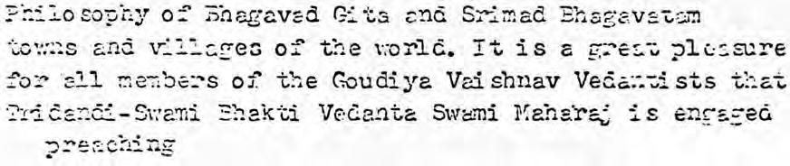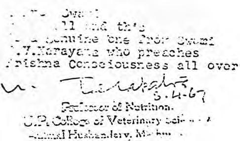 lily de<Jr ll:.1ya��rivu, !·lease cl-..cept" my blessings. Your letter dated · Oct. 3rd. sent to my Delili address is redirected t<, Culcutt;.1 6: t hcrc fot2 1 have delayed in replyjng •. ;ve are <"•�;<.dn 1envins this l'lnce fo1: Nnvai.twip a & you . cun rc.i.·l.v there, the ucl<.lrcss you will find on the envelop e. lt 1s so nlce_ to rend your Jetter &.:. the reply as to IH,w you a!":e alw§l;ya.: . tl1inkin,� fcJt· hrishnn. '.1nen you write to. say Uwt a:. 111 wuuld 11ke very much to be tcad1in:_s them hr ishnu Conscience in· stead of .J�nglish" it re�r.inds me of'Lord ChC!itunya. For some time Lord Chuitnnya wus conductin;� Cl CIH!tiH31Ii:lti, Wi!ich 'is a small tut-· orial u-illa�e class run bs n lenrn�llroJ;Jilin. ;\-hen Lord Clwit<:mya wus tectchin�� 6r<-Hamcr to h;hs stuclents ;w was explainin:!; l(risllrw. There is n Lhuptcr in S<;1nsc:rit :;rc.1n:lller wili.ch is cnlle(J Jnhtu , it is verb<Jl denominn tions. Clwit<my a 1·,!; •lw];rubhu was . uxplv ini n.; Da�n 1 ns hrishnD �i. lle would continue to cxpl<:li_n h!�isllnc.l in every step.·i\hen the stuclents felt tlwt the te nch cr WCIS cro�y tile Transendent· Cll ·reacher closed nis cJuss. So your desire to _teach i\ristmc.1 Conscienceness to tile students instcucl of r�n:�lish is very nice & Krishna wil.i IJe bestowlnc_; his Llessin(�S YJH,n you for your tuinkin: in tilot way. From my i)art ns 1 <!rn your ever well-wisi1cr l WlRll thot you may preach Krisllni:l Conscicnsss to the students of LiH� entire ,•,estern 'Vorld. You 0rc l't sincere scul � boli1 yuur i\;ot1J2r &. Fi.lthilr t.lrc iHliJI.-Y to S('C you ln J\rishnc..1 Consciencn(:>�s. l'len::;c co.nt inus thi s o ttituJ e throu:;11ou t your 1if e <x you wi11 be lld:ess e d not on 1y in tr.i s 1 ife b u t in your next eter·n al 1if e i n associn t iu! wit11 hrishn<'. hrislma lws given ov very nice chance iii the eity of 'dilke�-De1r�e l'enn. �;.:,the idee purclwsin.� J..:1nd as you iwve su�';gested is very nice. J tilink you CHl ne.�otinte for tnis le:uld innnedinte.ly &: the Society will be .able to pny �5·3,00CJ.Ou. r\ftcr· · p'(l.rclH:)sin;� tile land you c;m ;�racl\wll.y develope it. into eEl aslir[lfll by clint of yc.ur pcrson,:l l<:1bonr d.s tcnci1er inGhe-t.tese..-- collc�e. li'rO!:! !\.Y. the iil\i:mbers m<Jy visit the pl<1ce cv�o.�l'.Y weekend IJecause it isn't very fDr uwt.Jy. i.hcy take •l or 5 !leur jo11rney every weekend so E1 3 i10:.H' ,journey is not mucll. If ;yoL tlt:i.nl� you s!wJ.l !:;tiei·• to you;:· 1;rescnt occupc.1ti'Jn you cDn serict:sly t.,ird:.: of this sci•el�lC:,