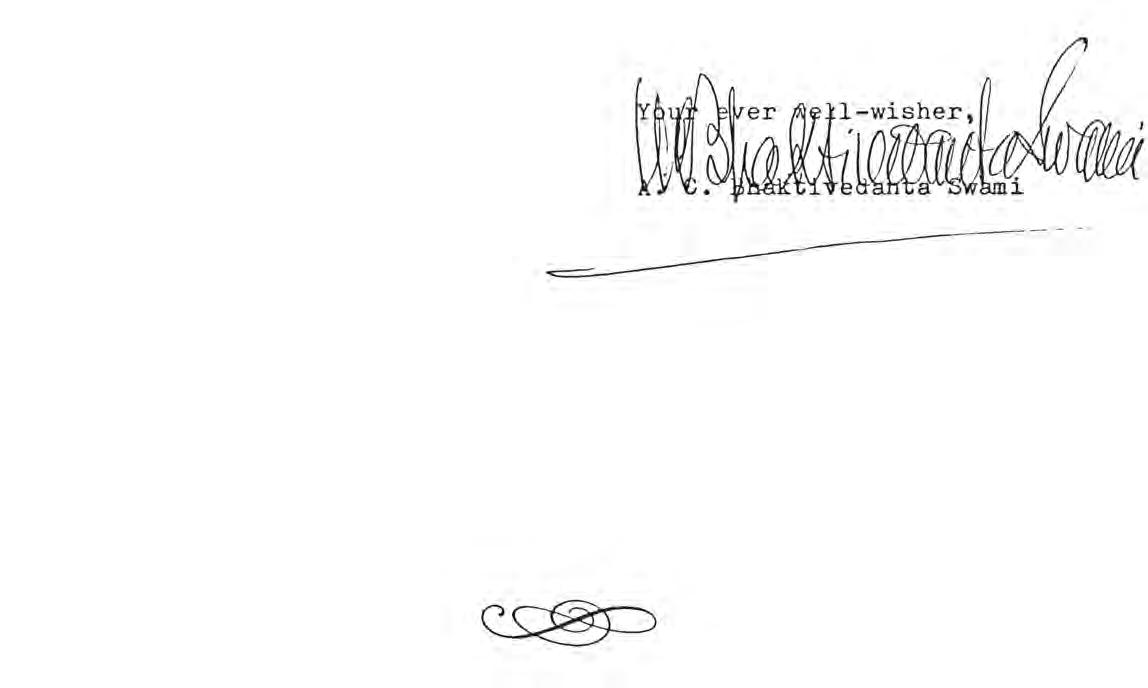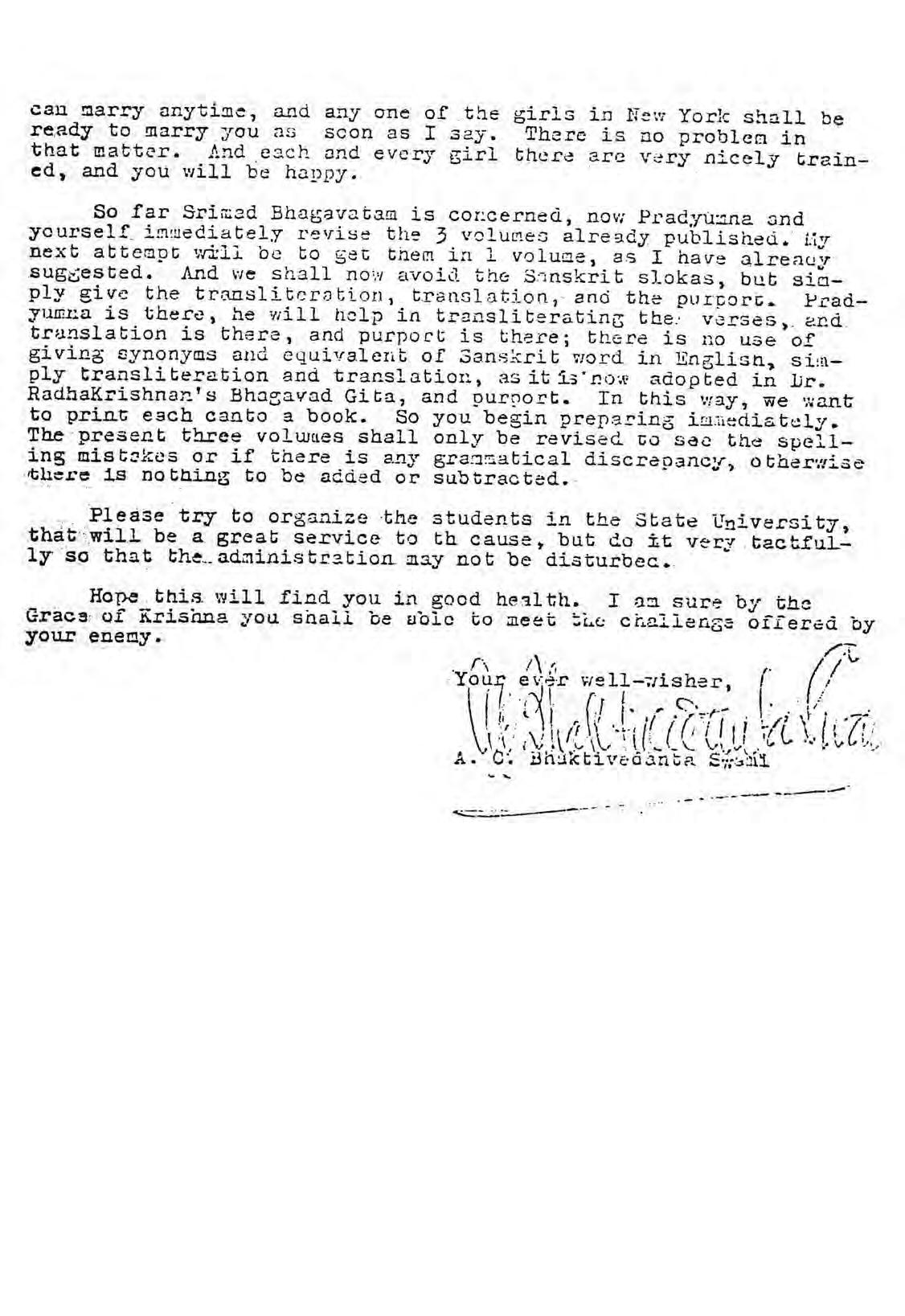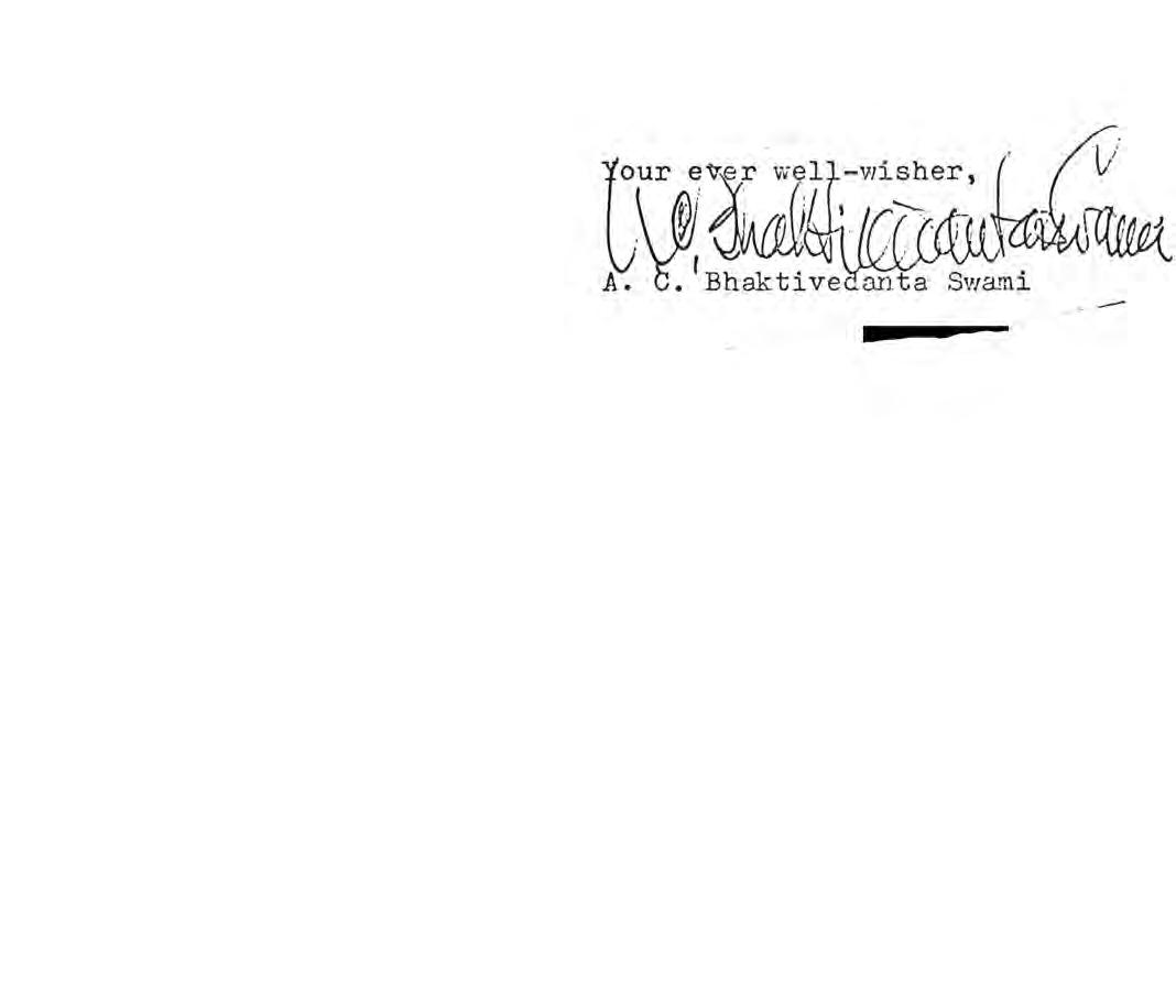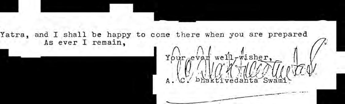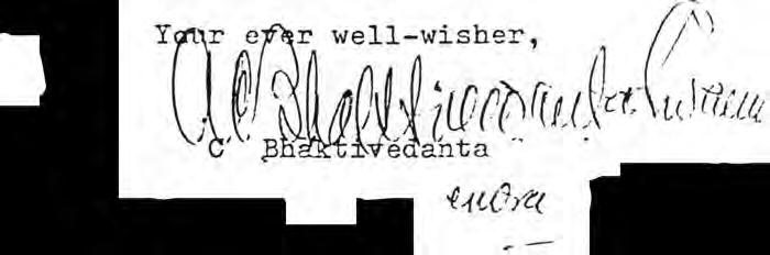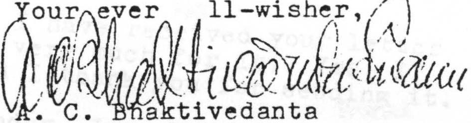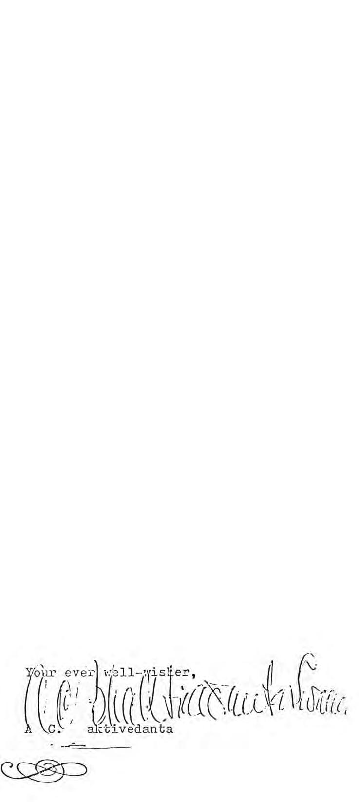 Bhagavad Gita is nearing completion--I heard this before I start� from India. The editing has been too much delayed. Now I request you to come here for a week with the full manuscript so that I can see it personall� along with yo� and finish the editorial work, within a ·week. Even after signing the contract, if the manuscript is not submitte&, it is regrettable. If it is not inconvenient for you, somehow or other, it will be better if you come here for one week absolutely for this purpose so that we can finish this job without further delay. If need be, it can be retyped also here. \ve have got two nice girl typists. I wished that the editorial department should be combinedly worked but it has not been successful. You are overloaded with so many works therefore it is being delayed; I can understand this. Therefore, I wish that you may come here for a week, suspending all other business and finish this Bhagavad Gita in my presence.