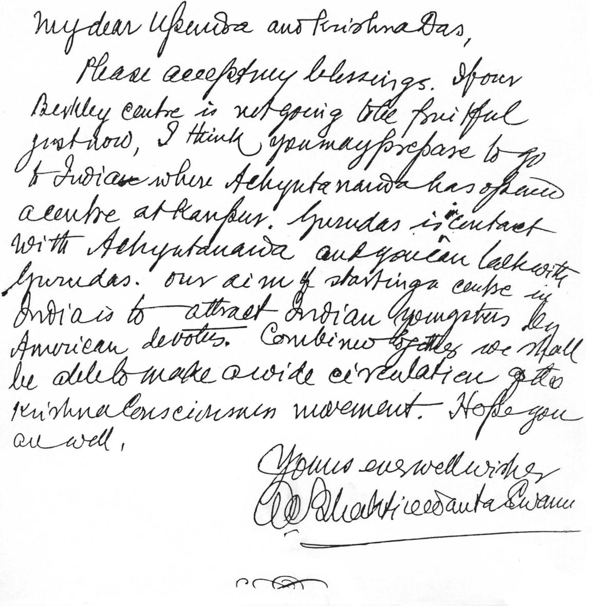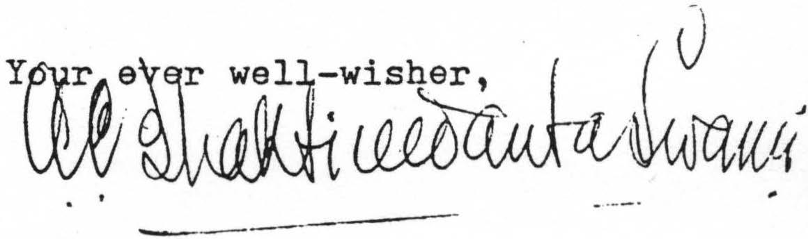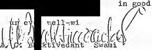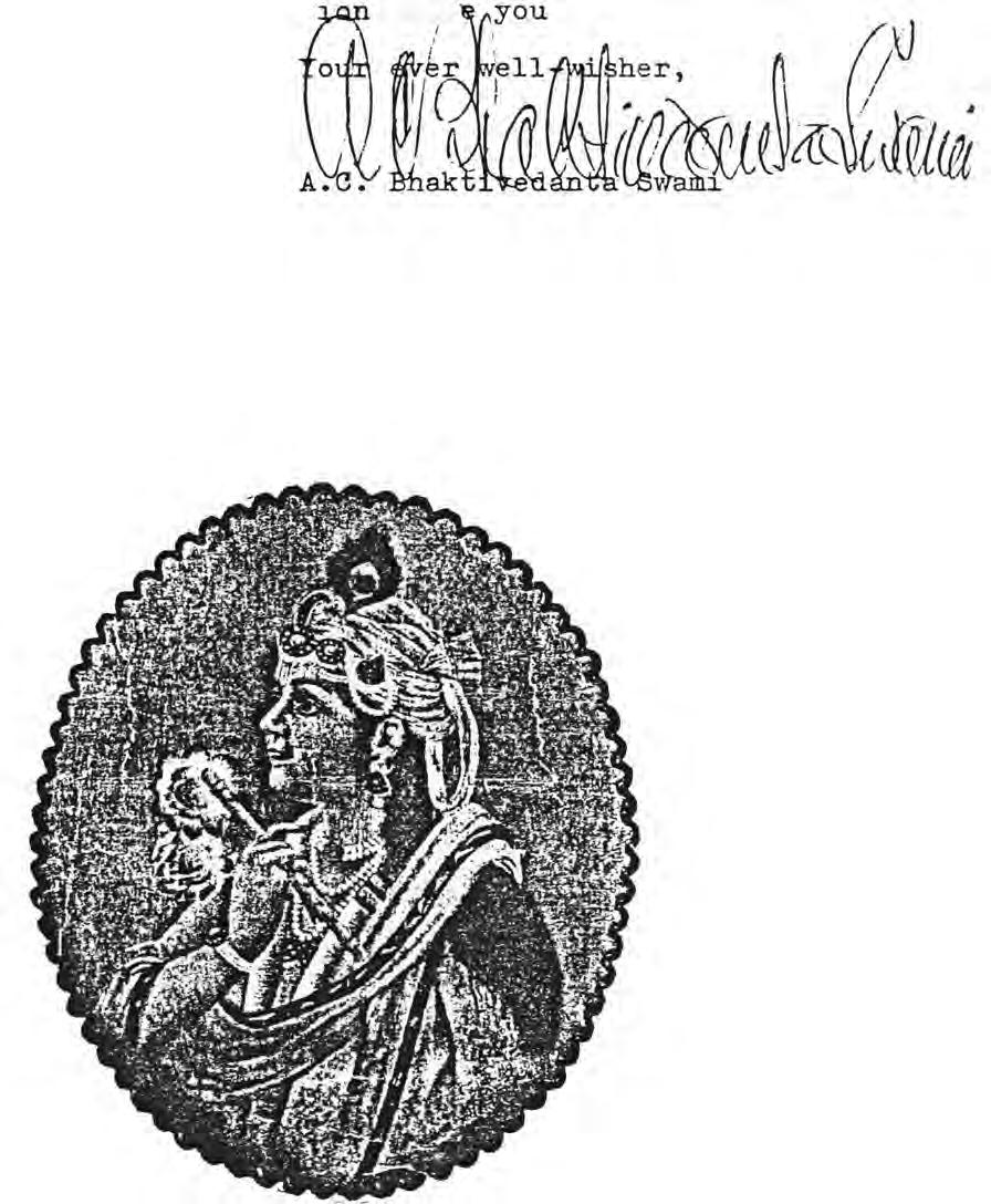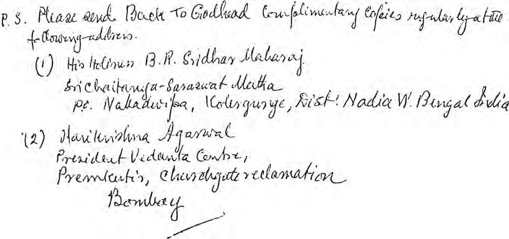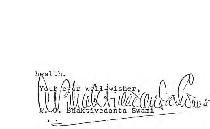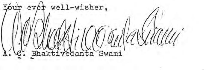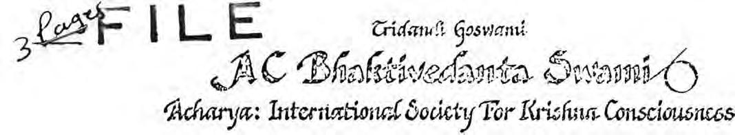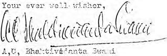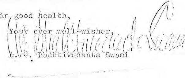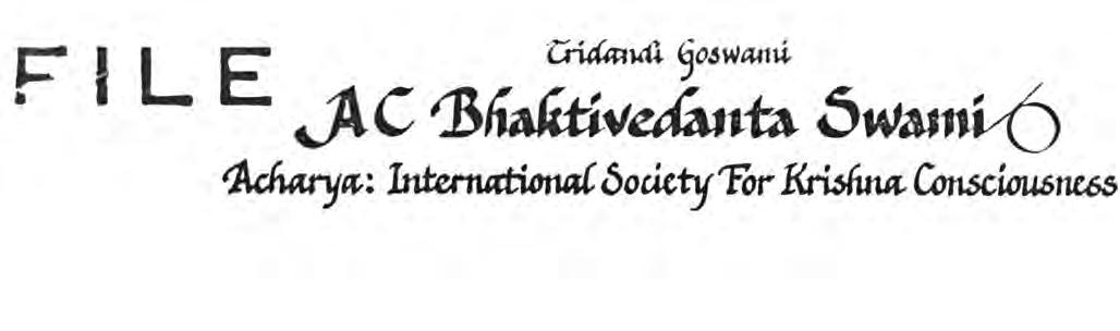 Bhagavad Gita is nearing completion--I heard this before I start� from India. The editing has been too much delayed. Now I request you to come here for a week with the full manuscript so that I can see it personall� along with yo� and finish the editorial work, within a ·week. Even after signing the contract, if the manuscript is not submitte&, it is regrettable. If it is not inconvenient for you, somehow or other, it will be better if you come here for one week absolutely for this purpose so that we can finish this job without further delay. If need be, it can be retyped also here. \ve have got two nice girl typists. I wished that the editorial department should be combinedly worked but it has not been successful. You are overloaded with so many works therefore it is being delayed; I can understand this. Therefore, I wish that you may come here for a week, suspending all other business and finish this Bhagavad Gita in my presence.