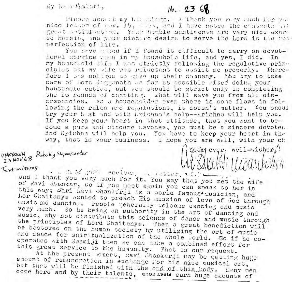 Please accept my glessings. I thank you for your nice long letter of 1/19/68, and of 1/17/68, and have noted contents carefully. \'Te rTill phone Ravi Shankar and make some arrangemnts 't·Tith him as is possible. Regardin;; Ha::.1u.nan Prasad 2o Poddar, he is not so formidable rascal, but you can read his literature. He is a sincere worker in Krishna Consciousness. His defect is that he is Impersonalist, but he can not remain long an IMpersonalist because he is devoted to Radha and Krishna. Recently he has sent me one letter of appreciation for my activities here. There is no objedtion to reading his books. Regarding the other books; keep them very nicely, and I shall see when I go there to Nerr York • You might have received another book, perhaps; by Bhaktisaranga Goswami. This book by mistake waa sent, perhaps: it has to be returned.