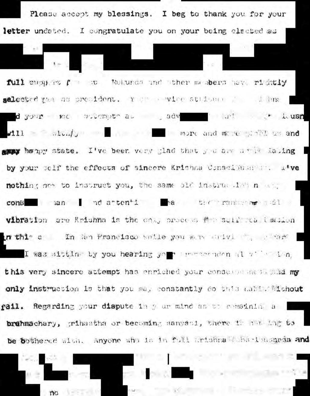 I have noted. from your letter that you have available a Lincoln auto�r.obile "�.-lhich you are able to clonate to us in Los .lmgeles . At the present 'ole are requiring just such a car so I think you may r:2e.l:e arranGements to hc:n--e it brought here . This is all Krishns.'s Grace so as you are able rlee.Ee make arrangemen ts for t�1is. So far as yo ur utiliz ing r:1achincry e,t . Ne':l Vrinde.ban, iL:s.uch ma.chine2.."'Y is helpful th�tn you may take advantage of them. 'de are not ene:nies of xacb.ines. If they can 1)e used for Krishna's service then \·;e 'tt/elcome them.