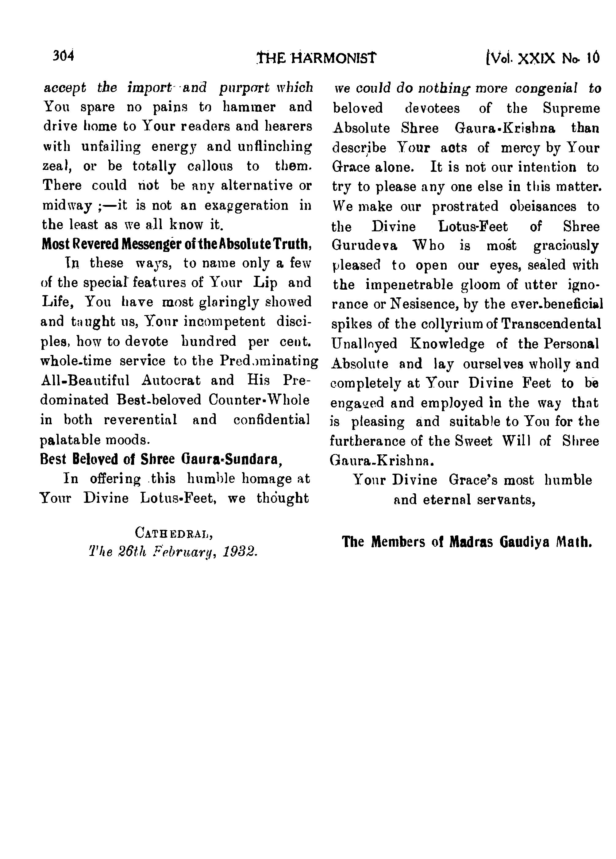 English was the language that Srila Bhaktivinoda Thakura identified as the most popular and fluent amongst learned people ofhis time. He began spreading the message of Sri Chaitanya in English in 1896 by sending histreatise Chaitanya Mahaprabhu-His Life and Precepts to the McGill UniversityofCanada and also to England. His son, SrilaBhaktisiddhanta Saraswati, hadclosely seen his father's eagerness to give knowledge of Sri Gaura to the Western world. He then received the divine inspiration to pursue his father's task and begun the English publication of The Harmonist magazine, which was previously published by his father in Bengali and known as Sajjana-tosani. A foreword by Srila Bhaktisiddhanta Saraswati Goswami Prabhupada explaining the full meaning of The Harmonist's original Sanskrit title can be read on Volume No. 1, Vol. XXV- June 1927, page 2.