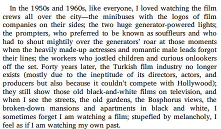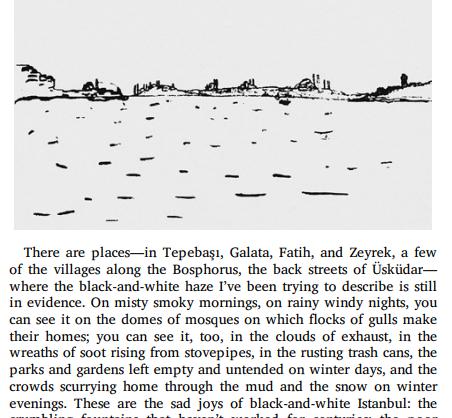 [4] of all the ships in the sea sounding their a halt to salute the memory of Atatürk at 9:05 cobblestone staircase with so the morning of with so much asphalt poured over it that its were for centuries glorious street fountains of the apartment buildings in the side streets families— of doctors, lawyers, teachers, and apartments listening to the radio in the evenings, packed with knitting and button machines and lowest wages in the city to meet urgent orders; toward Eyüp from the Galata Bridge; of the simit as they wait for customers; of everything being storks 8ying south from the Balkans and northern down over the entire city as they waft over Marmara; of the crowds of men smoking cigarettes during my childhood never failed to end in abject