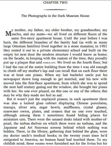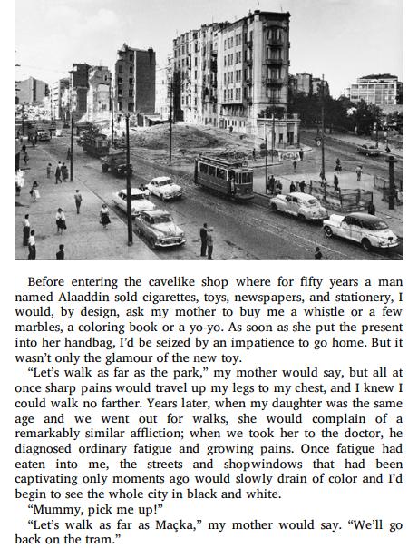 [2] of the walls covered with frayed and blackened Chevrolets that would be museum pieces in any huffing and pu@ng up the city’s narrow alleys with passengers; of the mosques whose lead stolen; of the city cemeteries, which seem like cypress trees; of the dim lights that you see Kadıköy to Karaköy; of the little children in of tissues to every passerby; streets who try passerby; of the clock towers no one ever notices; read about the victories of the Ottoman Empire receive at home; of the days when everyone has compiled or the census can be taken; of the facilitate the search for terrorists and everyone cials”;