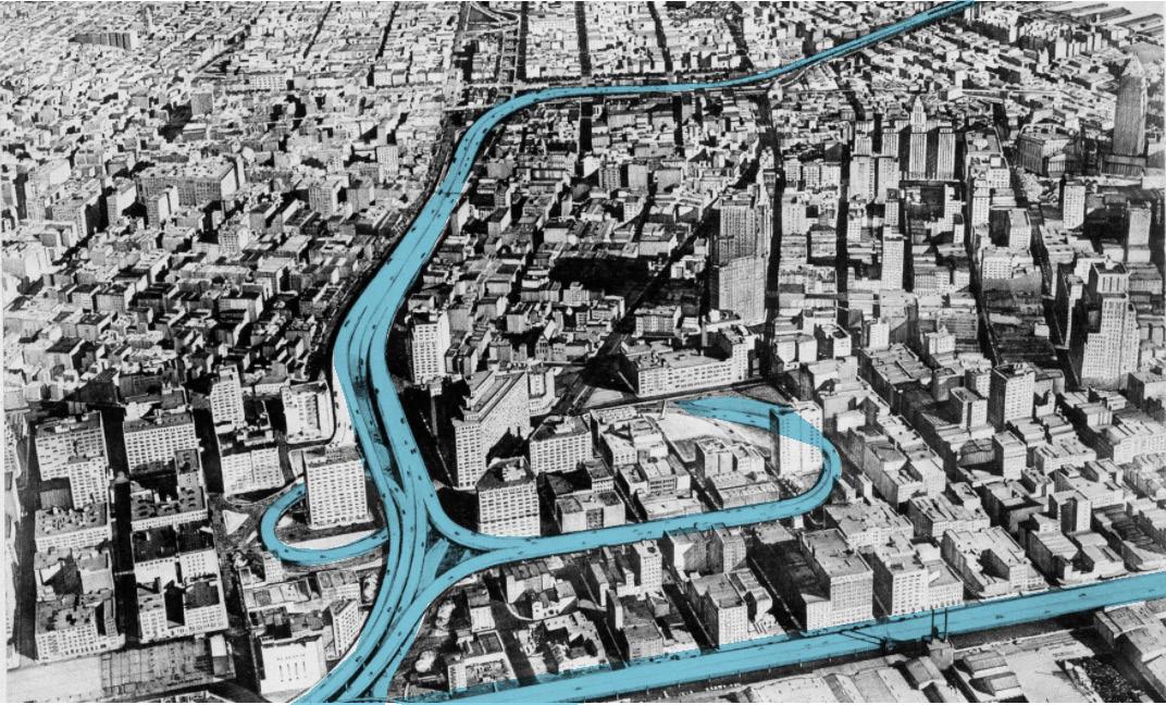 The background to Jane Jacobs' book is the proposed construction of a highway in Greenwich Village, where she lived, by New York city planner Robert Moses in 1955. Moses subscribed to the modernist urban planning ideology, which viewed cities as diseased and sought to address this through large-scale infrastructural solutions, often resulting in the destruction of city features.