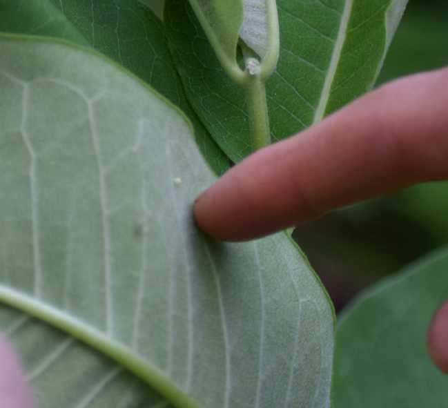 They attach their eggs to the underside of the milkweed leaves.
