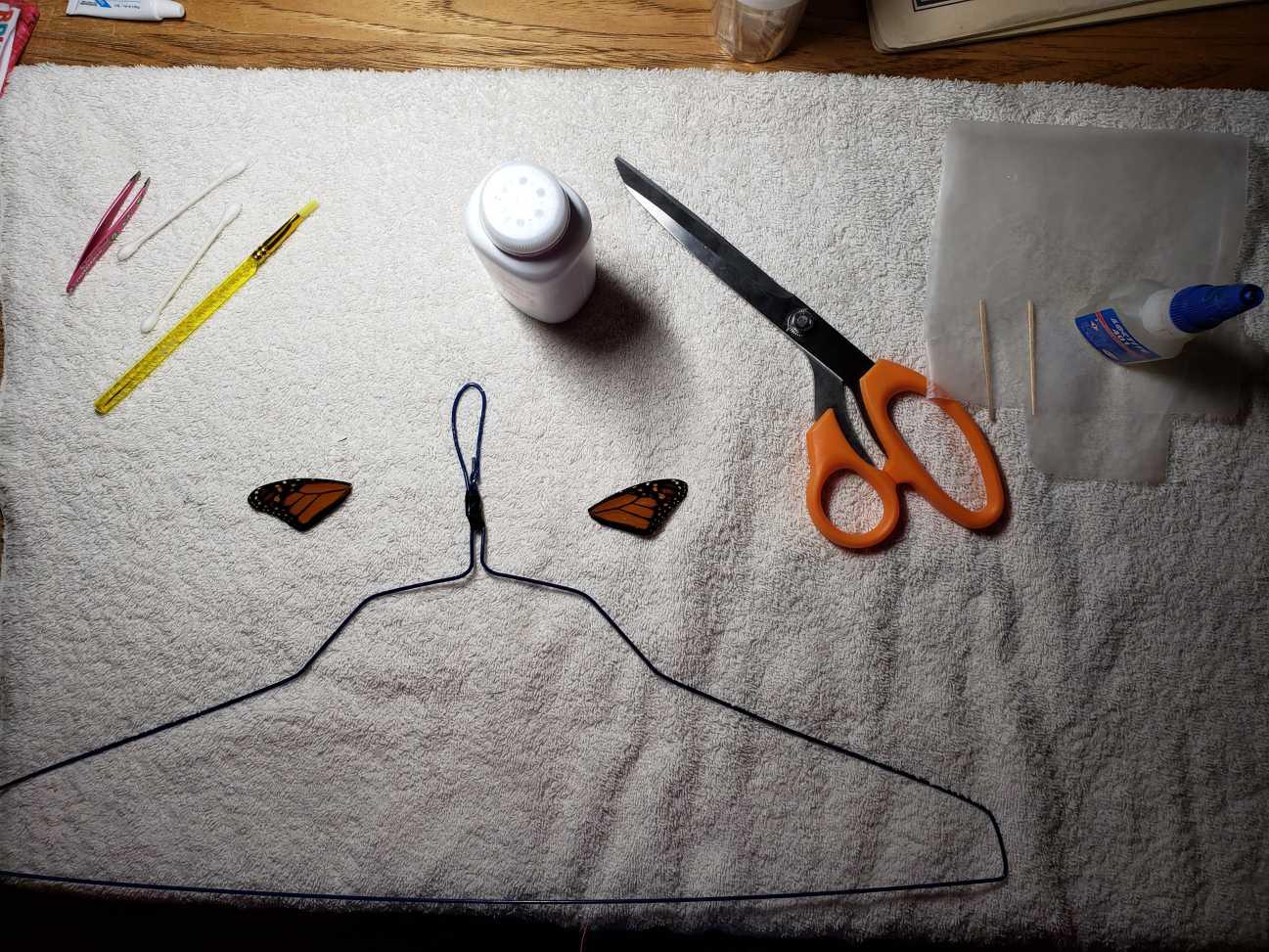 She needed scissors, fabric glue, a wire hanger, baby powder and a few other things. Then she was ready to perform the procedure.