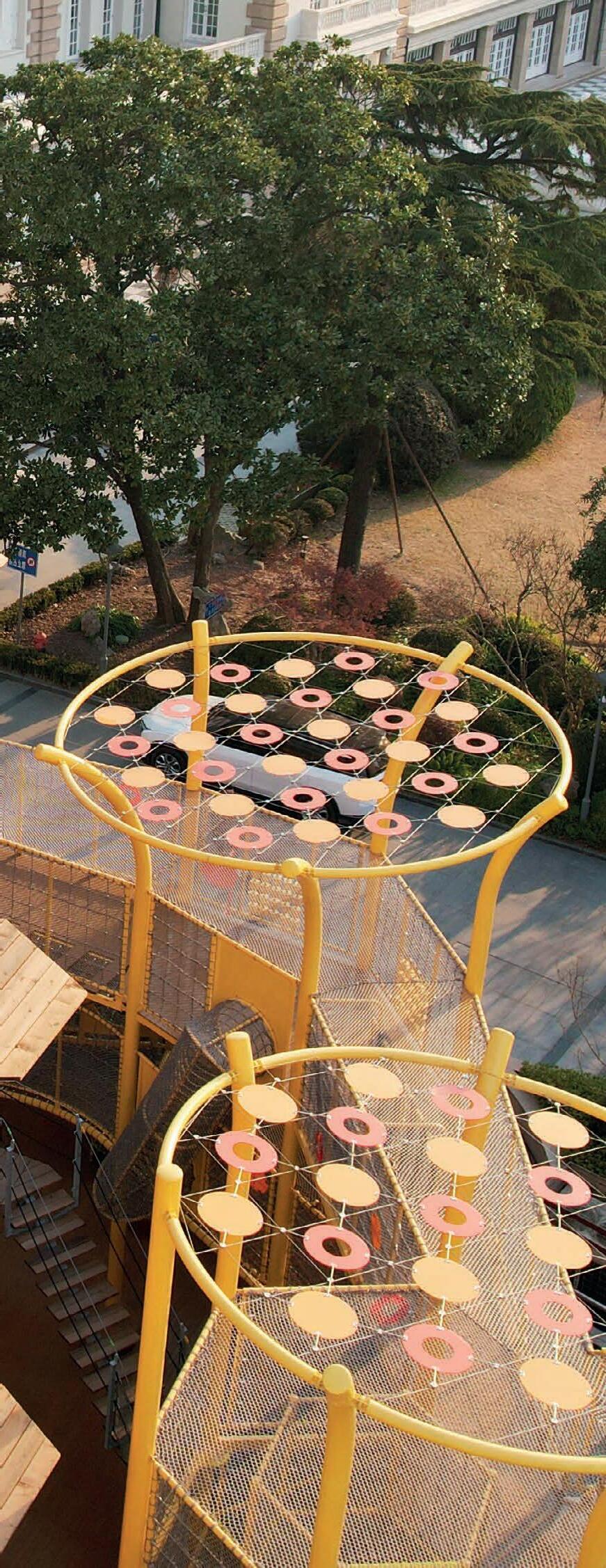 这座拥有13柱、3个攀爬层、78个攀爬元素的高空绳索乐园项目位于上海北外 滩。该项目附带低空蹦极、巨人秋千、疯狂滑梯,以及包含16个攀爬元素的儿 童攀爬层。一个覆盖项目主体的400㎡顶层观景平台,不但能让游客饱览黄浦江 两岸盛景,更为不同类型的定制活动提供了奇妙的空中场域。为了抵御沿海地区 的潮湿气候,项目中使用的钢结构和木材均经过特殊的防锈、耐盐腐专项保护处 理。