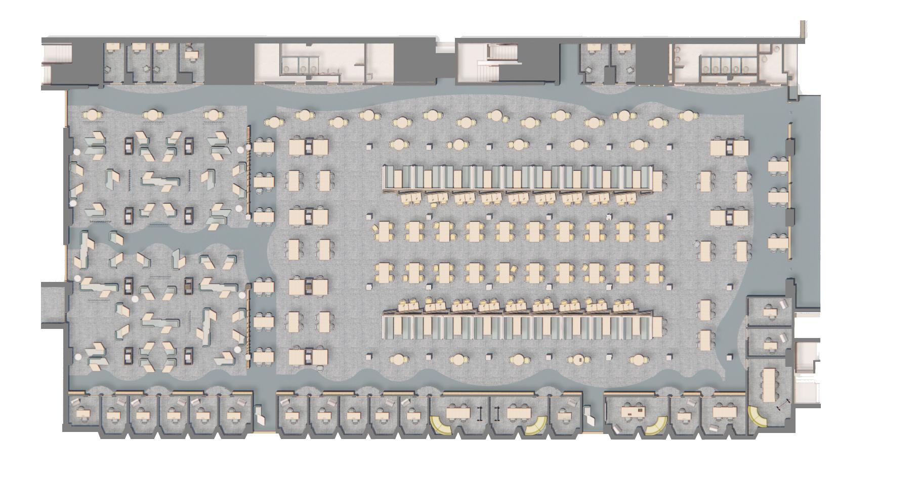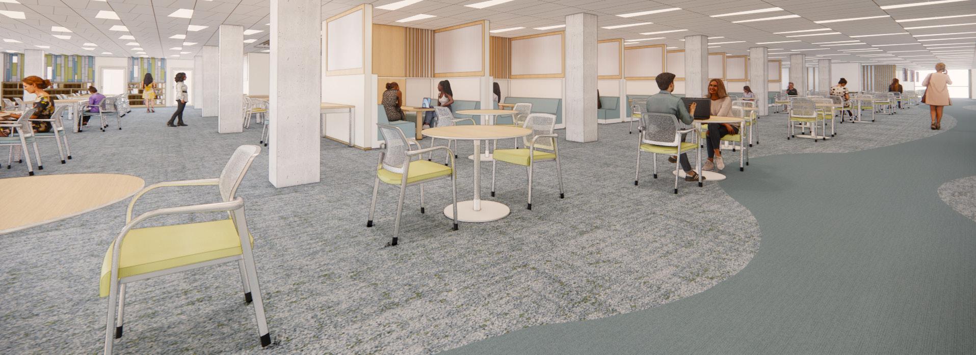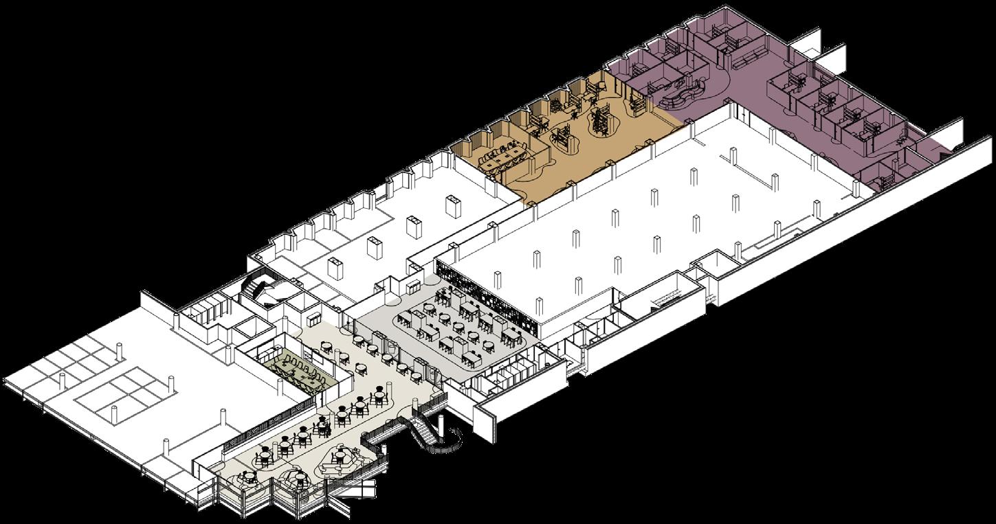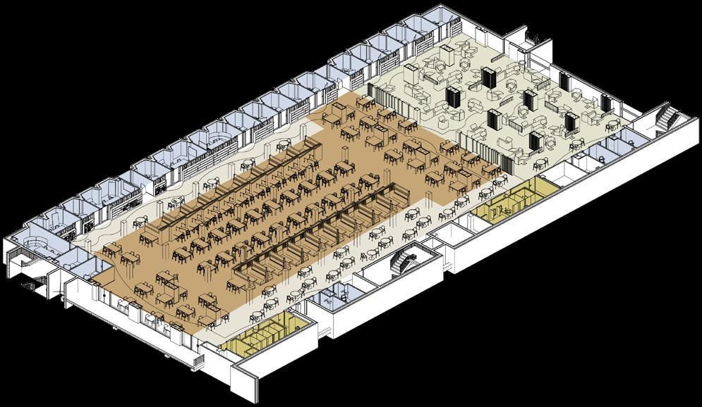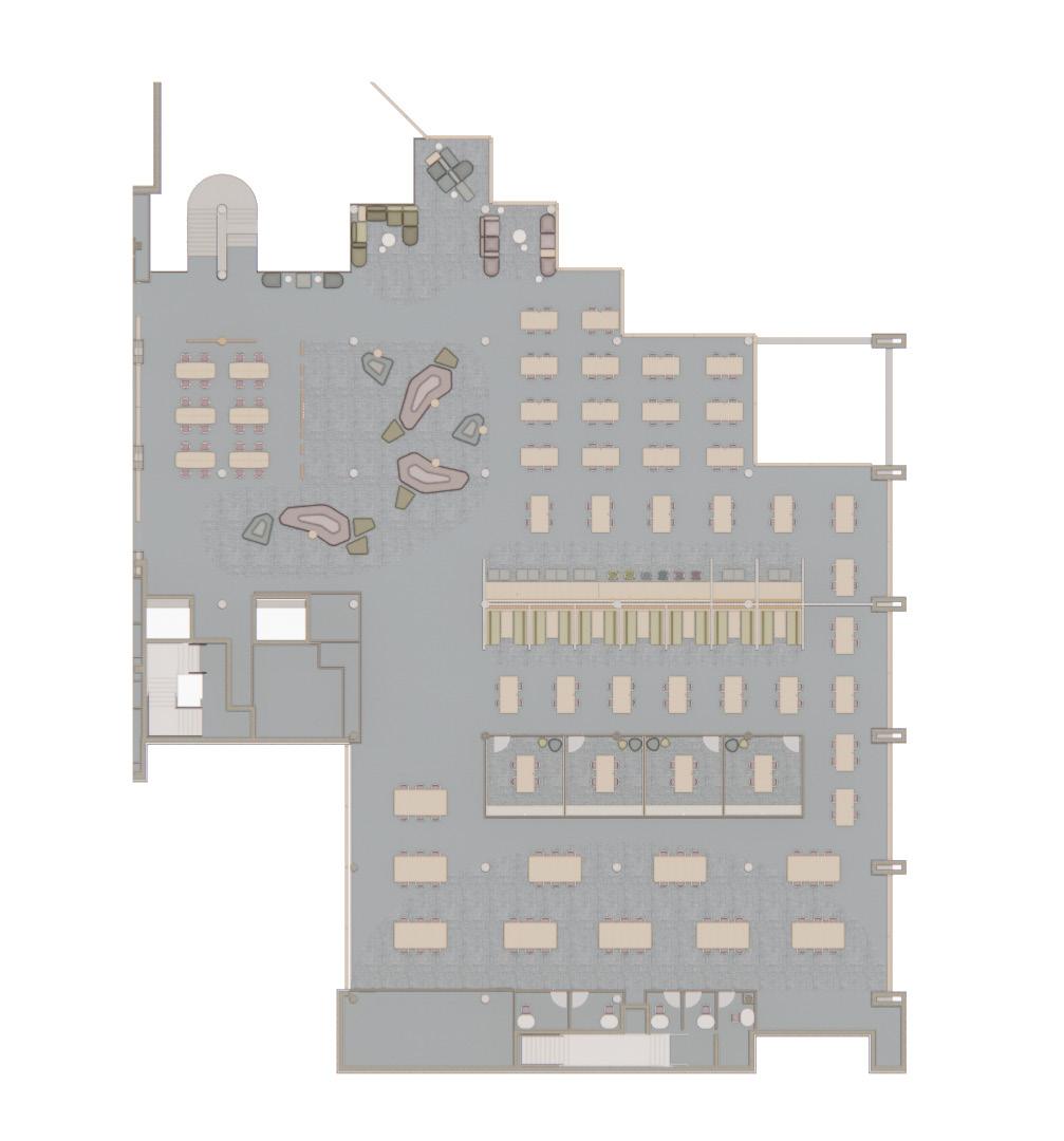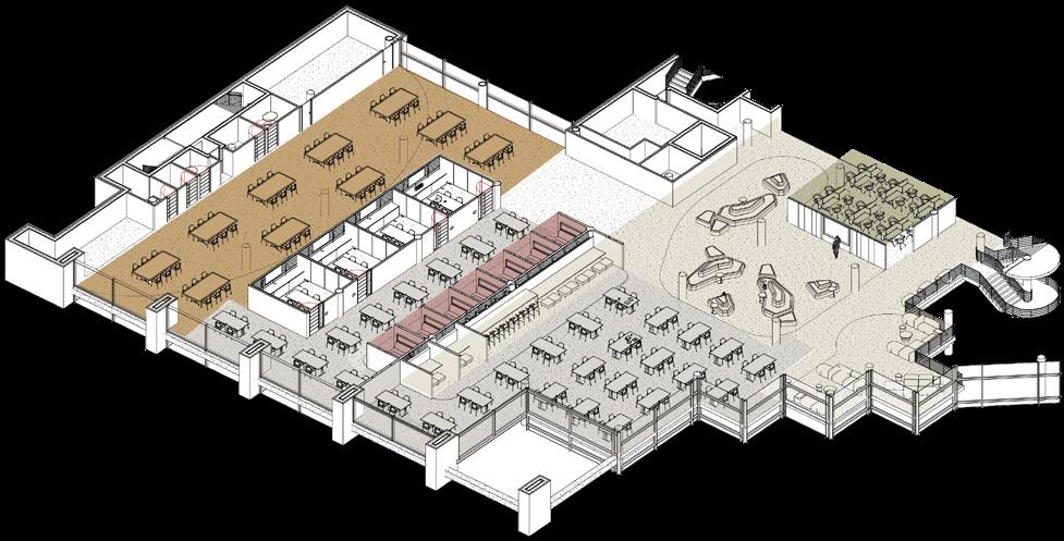 In a effort to control noise and increase use of the entire space it is separated it into zones. Zones are categorized by amount of people studding and furniture reflect these patterns.