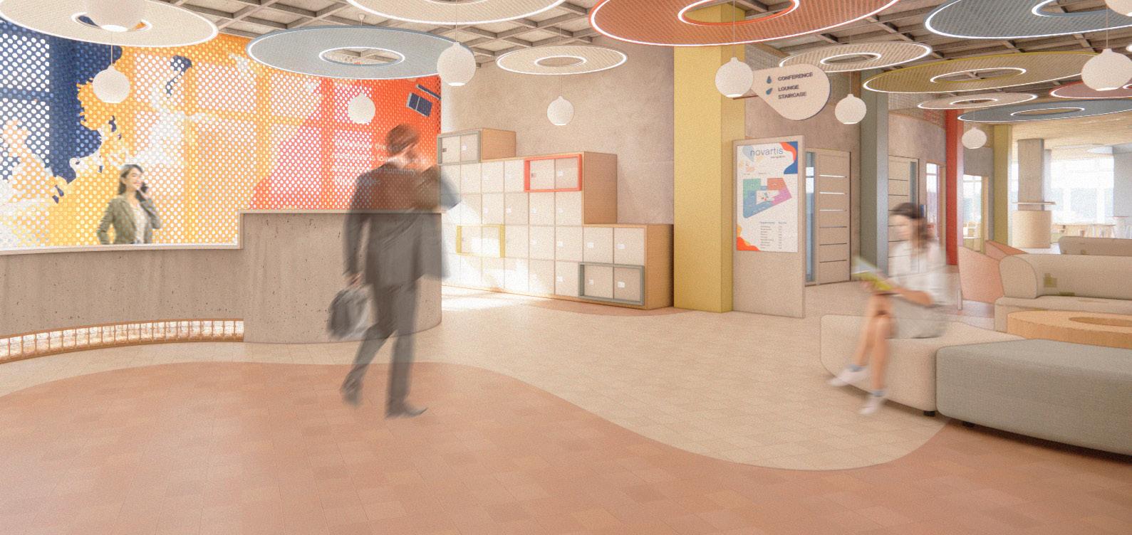 Novartis office located in Washington, DC on the 11th and 12th floors of the Blake Building. The design integrates a strong brand image and wellness amenities such as a coffee bar, Rockwall, wellness rooms, and fitness spaces. An phone app better connects employees and their outside environment using features that engage socialization and movement in order to enhance employee wellbeing and environmental consciousness.