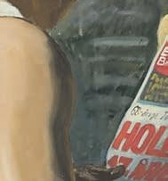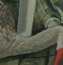 Men sådan ser de fleste af os jo ud, når vi krænger tøjet af os. Det er faktisk befriende, at Kvium taler mediernes undertrykkende kropsidealer ned til fordel for en superrealisme, som han samtidig giver en ekstra kant. I maleriet ”Turisten” (2017) har vores mand afført sig turistens obligatoriske T-shirt. Nu er hans solbrændte ansigt, hals og arme blotlagt, mens hans kridhvide hud på kroppen næsten blænder. Umiddelbart tror man derfor, at han