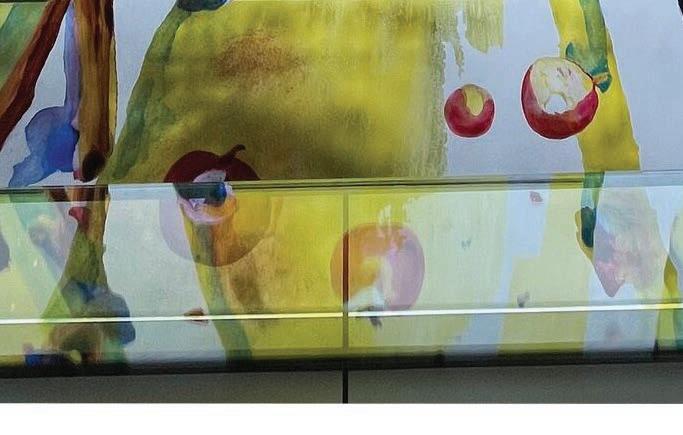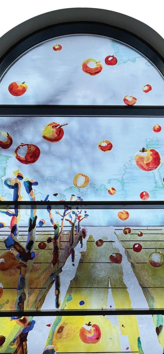 Tovborg bidrager også med to stedsspecifikke værker: en stor roset, også den med motiv af datteren Dea, udført i farvet plastfolie og monteret direkte på ARoS’ vinduer som en kirkemosaik og med appel til den omgivende by. Endvidere en enorm freskofrise i naivistisk stil med motiv af æbler, malet direkte på væggene i atriet på niveau 1, hvor udstillingen finder sted. Værket er skabt i samarbejde med lokale kunststuderende og har oplagt reference til Syndefaldet, men henviser også til techgiganten Apples berømte logo. Især to monumentale malerier springer i øjnene: det apokalyptiske ”Menneskehedens alter” med urskiver, der viser lidt i 12 og med et mylder af ornamenter og stiliserede figurer. Det enorme