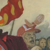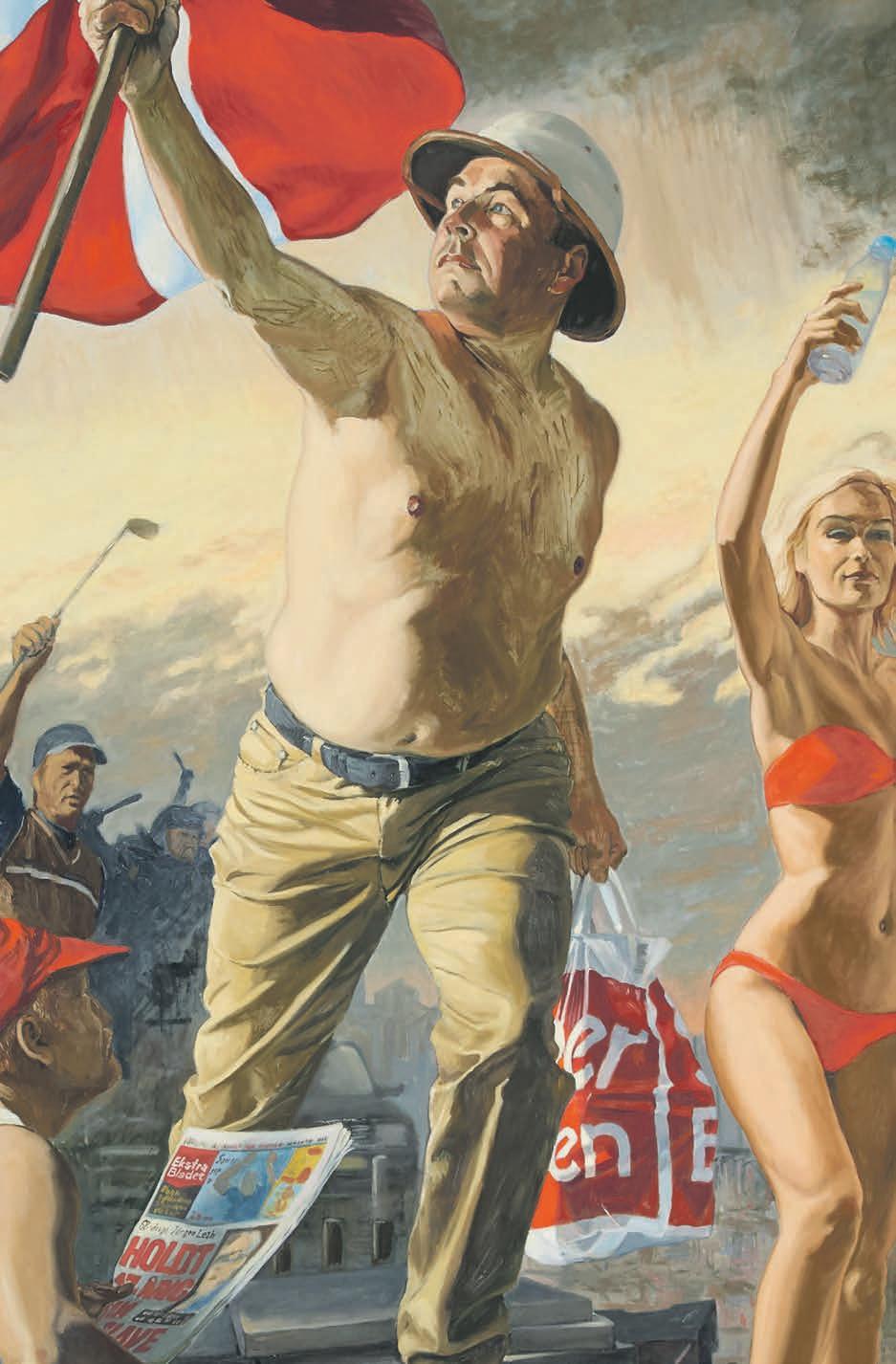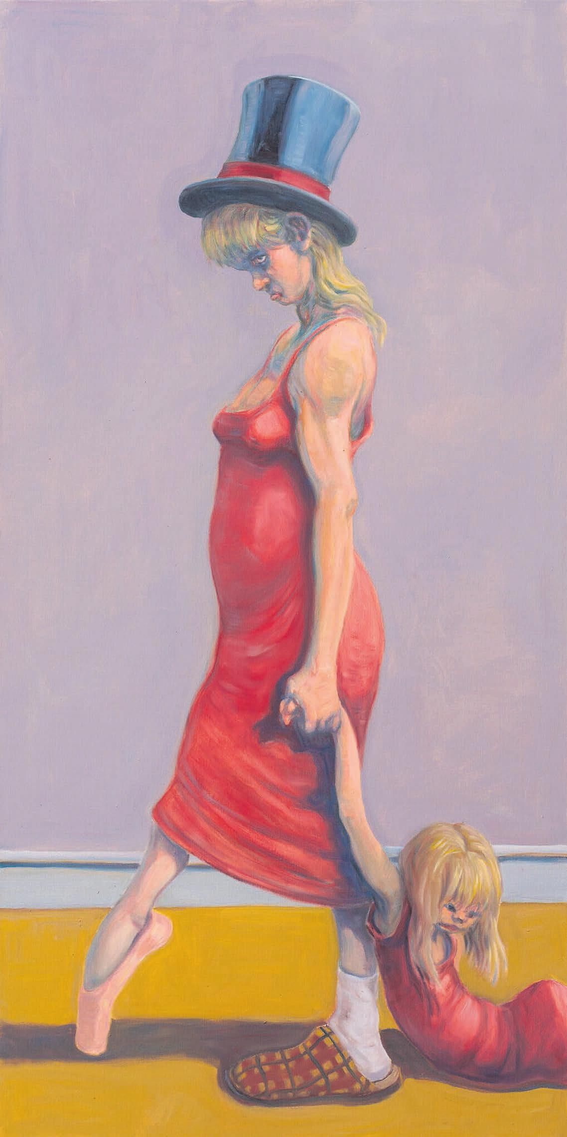 0 ”Hverdagen”, olie på lærred, 100 x 200 cm, 2021. Michael Kvium sætter tingene på spidsen i sine groteske genremalerier af hverdagslivet. Her ses en mor, der slæber sin datter efter sig, som var hun en klud, hun skulle gøre rent med. Bemærk moderens fodtøj: Balletskoen på den højre fod og sutskoen på den venstre, og ikke at forglemme cirkushatten på hovedet af denne uforløste og frustrerede, hjemmegående kvinde, som drømmer om at komme væk fra pligterne som husmor og mor og blive forløst som verdensdame. Men hun glemmer det afgørende; nærværet over for sine nærmeste. FOTOS: ANDERS SUNE BERG