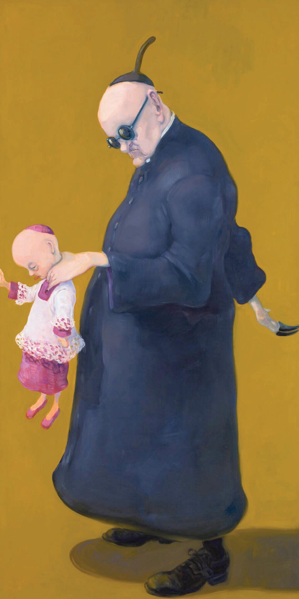 0 Michael Kvium: ”Den blinde”, olie på lærred, 200 x 100 cm, 2012. Den onde, katolske munk forgriber sig måske snart på den lille messedreng. Bemærk munkens knivskarpe klov på ryggen. Blindheden er hos Kvium ofte en metafor for fortrængning og ansvarsforflygtigelse. Michael Kvium voksede op i en katolsk familie i Horsens. I mange af sine værker beskæftiger han sig med den katolske kirkes overgreb på uskyldige børn i kirkens tjeneste. FOTO: ANDERS SUNE BERG