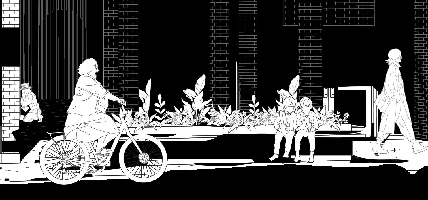 A protected pedestrian spine links the train, library, school, and park, transforming the site into a safe, carfree connector that can extend the public space and strengthen everyday access to community resources.