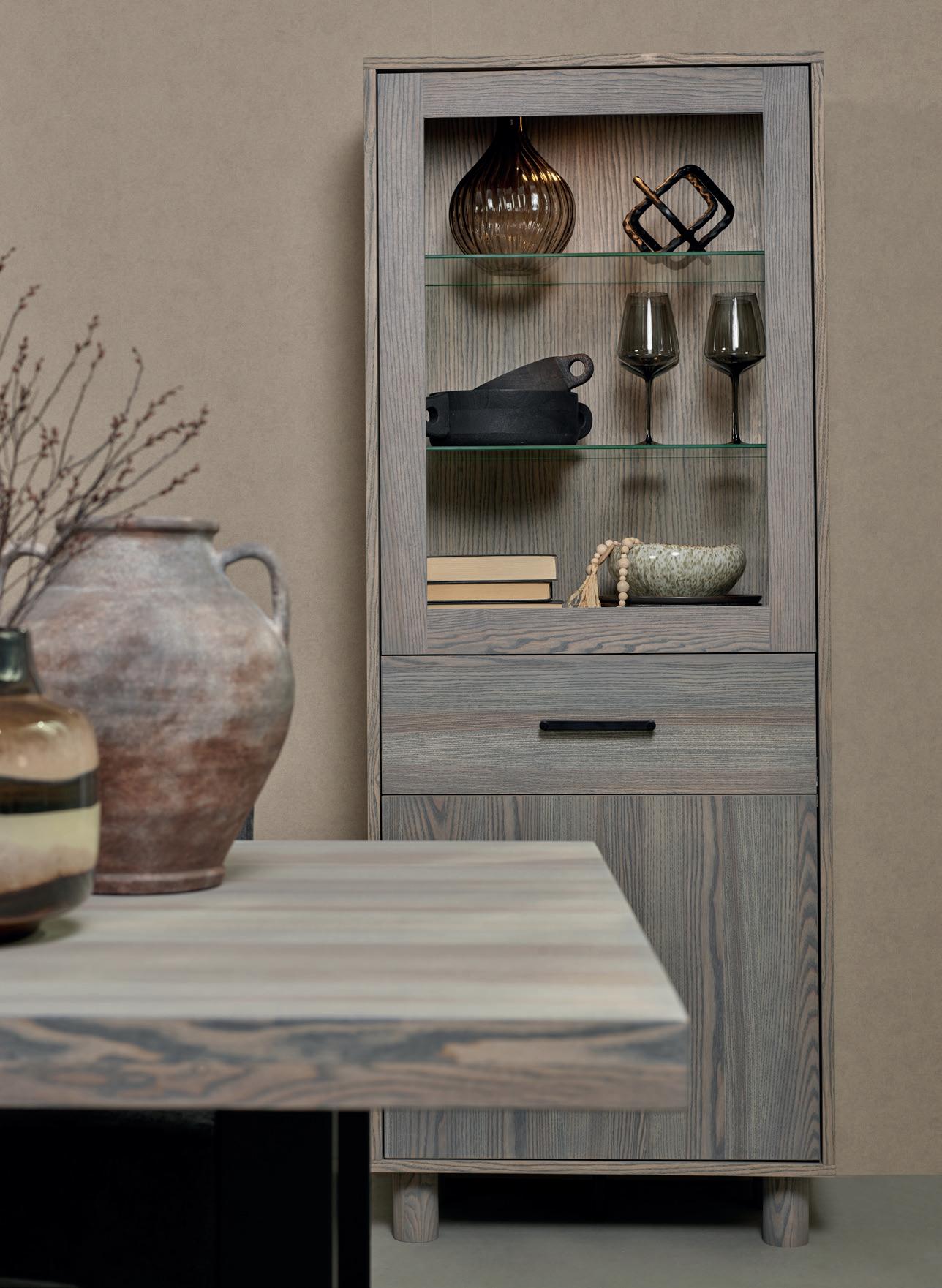 Elements vitrine er her vist i C13 lys grå oljet ask med ben “ W12 ” runde treben.