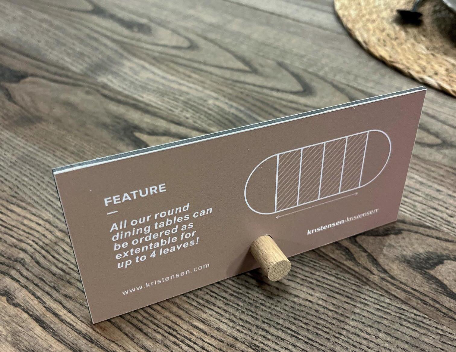 Table stand with wooden stick that tells the key selling point for round tabels.