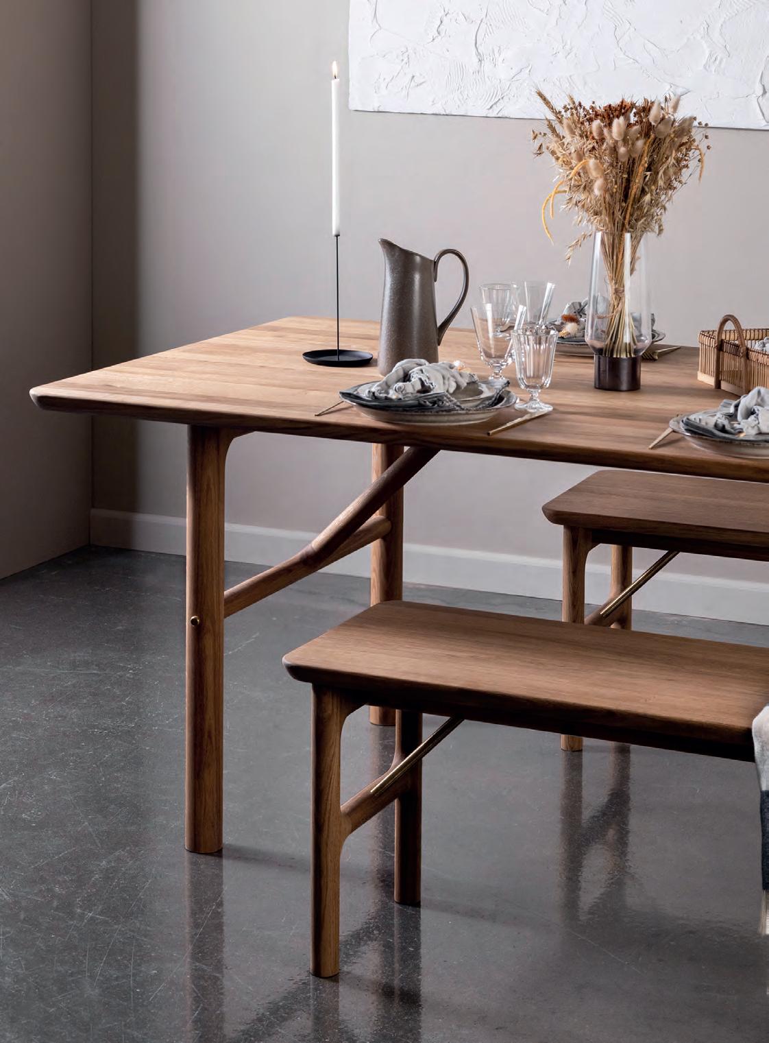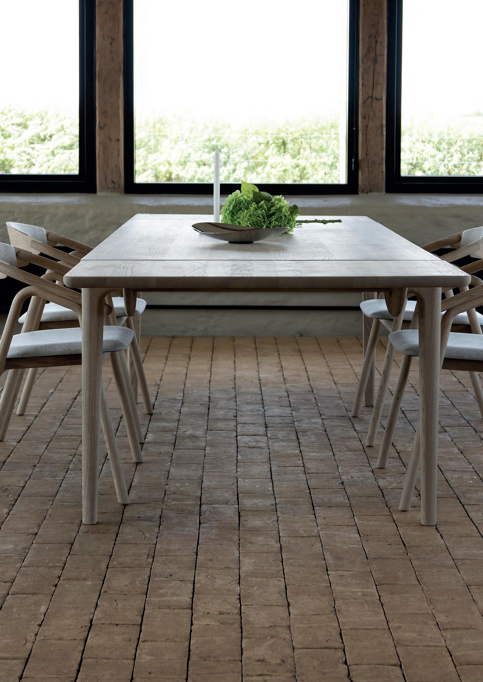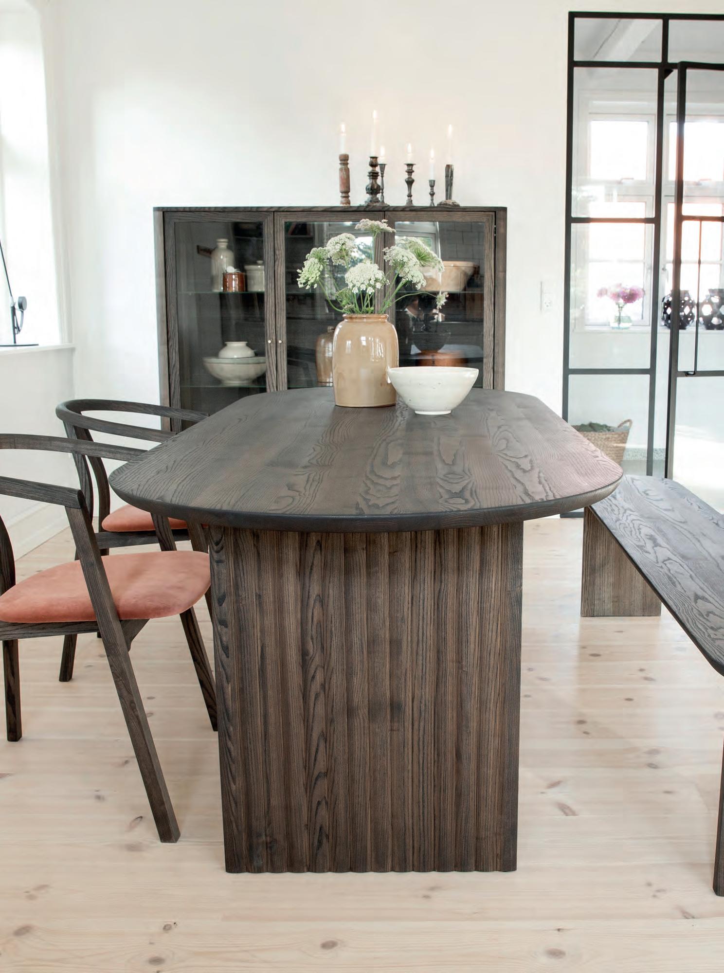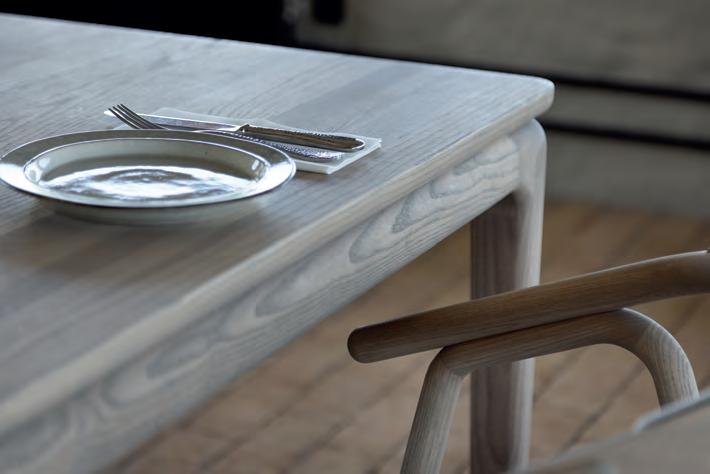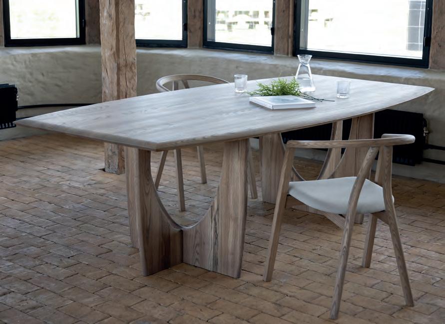 The LONGBOAT dining table is characterized by large solid wood planks, where the shape imitates the curves from the old ships.