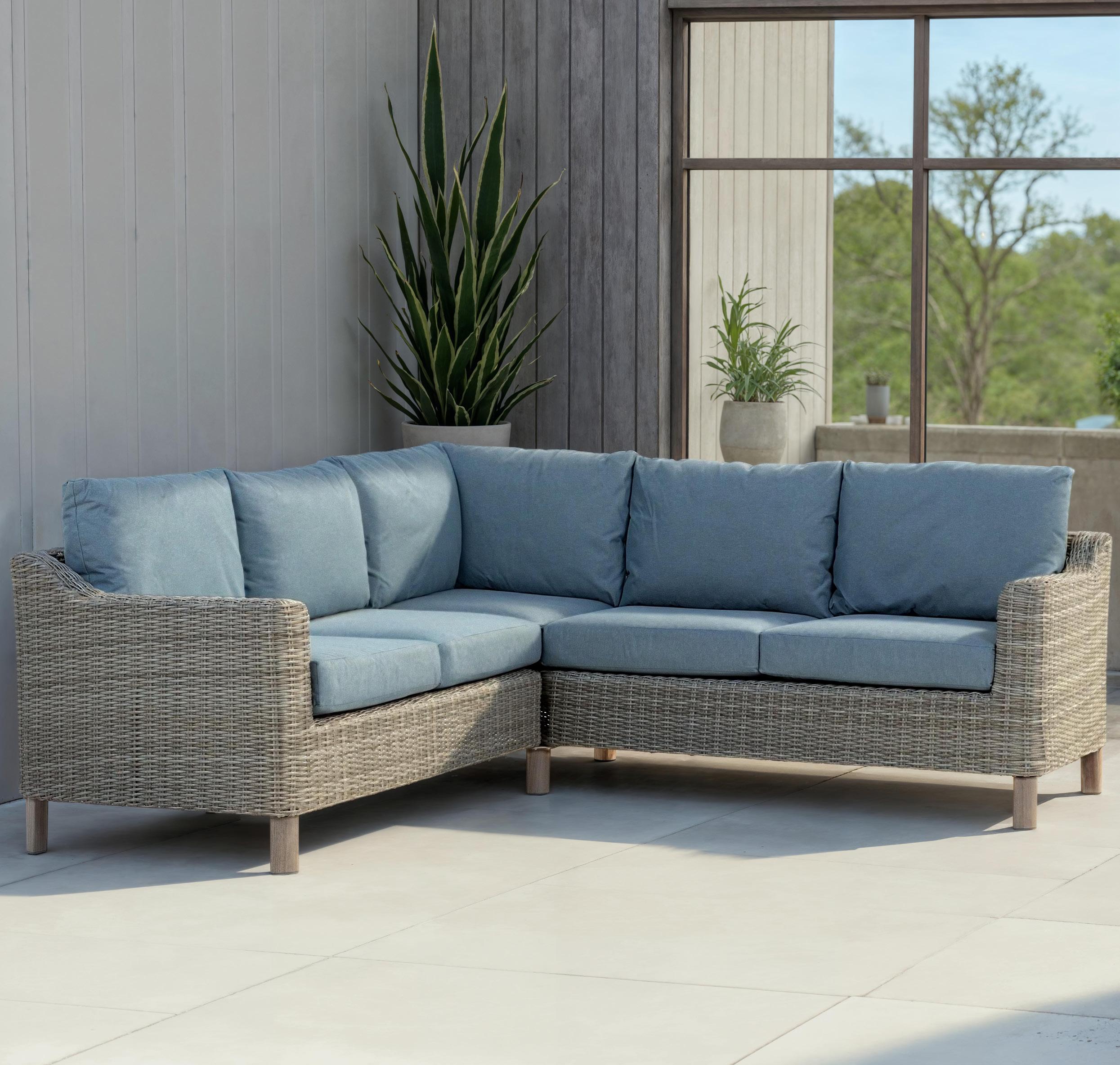 Product care: Store cushions indoors or in a cushion box and covering the frame. Use a furniture cover to protect wicker, and apply Goldencare Teak Protector regularly to maintain teak.