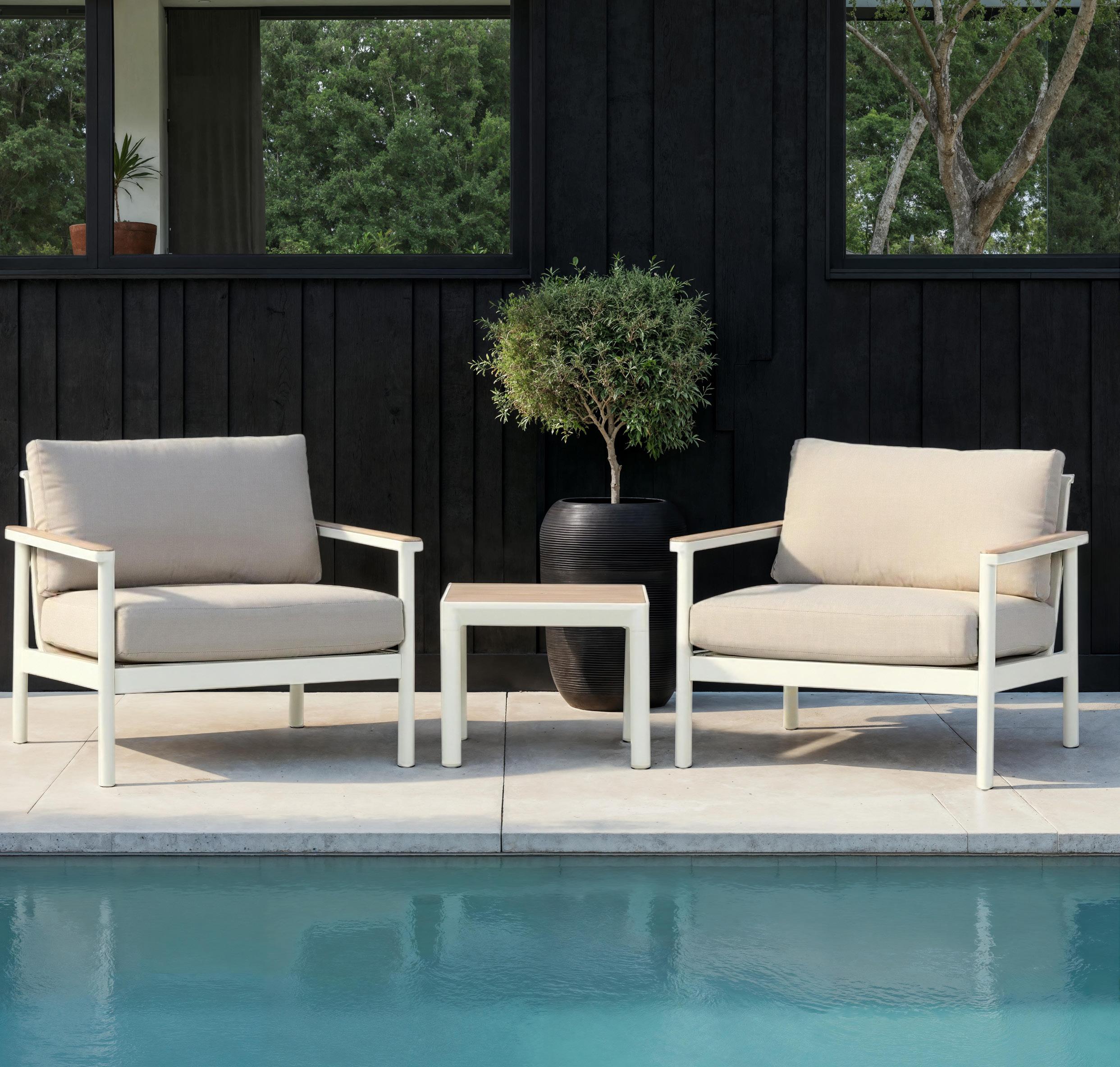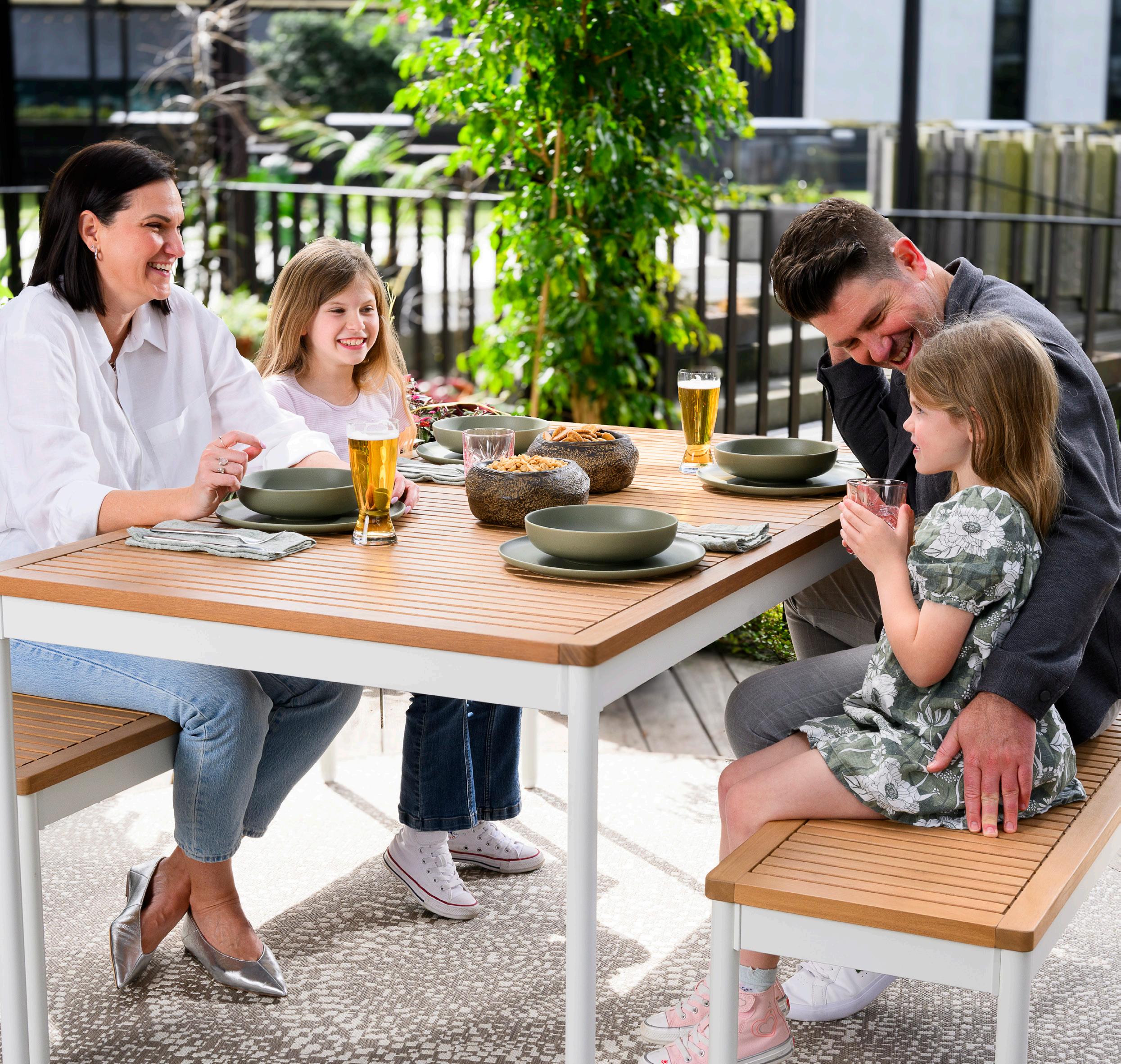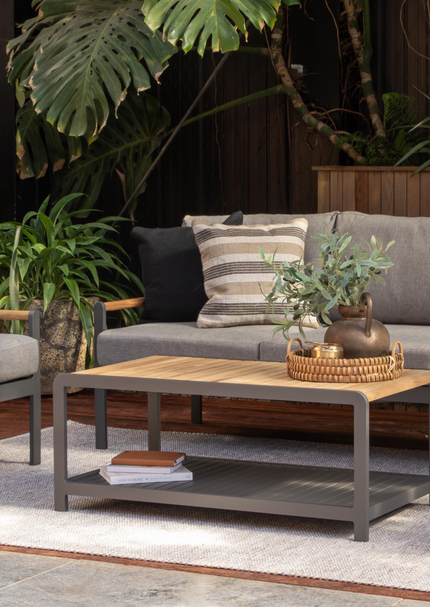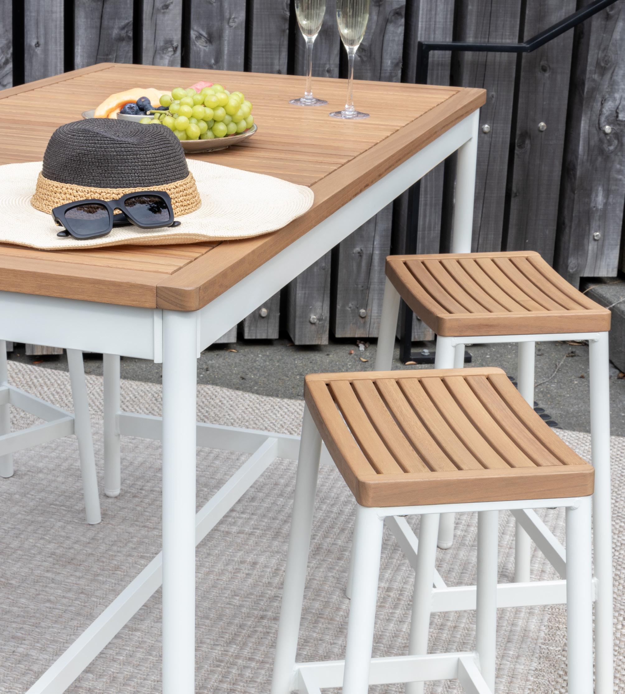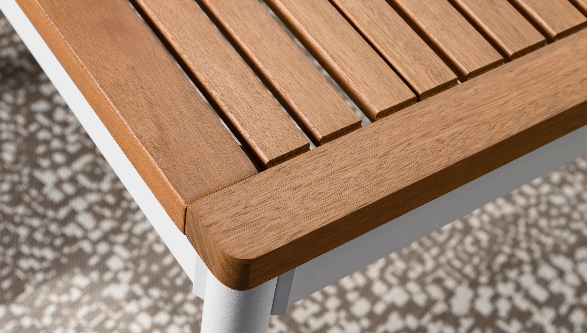 • Durable & stylish – rust-free aluminium frame with solid teak table tops and detailing, built to last.