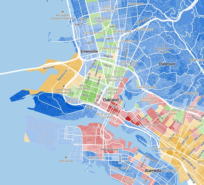 In this final map of the project, I introduce what city planners have done to help remedy the effects caused by mid-century redlining and freeway construction. The major difference would be the removal of the Cyprus Viaduct that carved out rows of West Oakland neighborhood blocks. Now a wide avenue with green space, I should have used a different line type than to visually categorize it with the other MAJOR STREETS on the map. This would have made this major change in the neighborhood easier to highlight on the map.