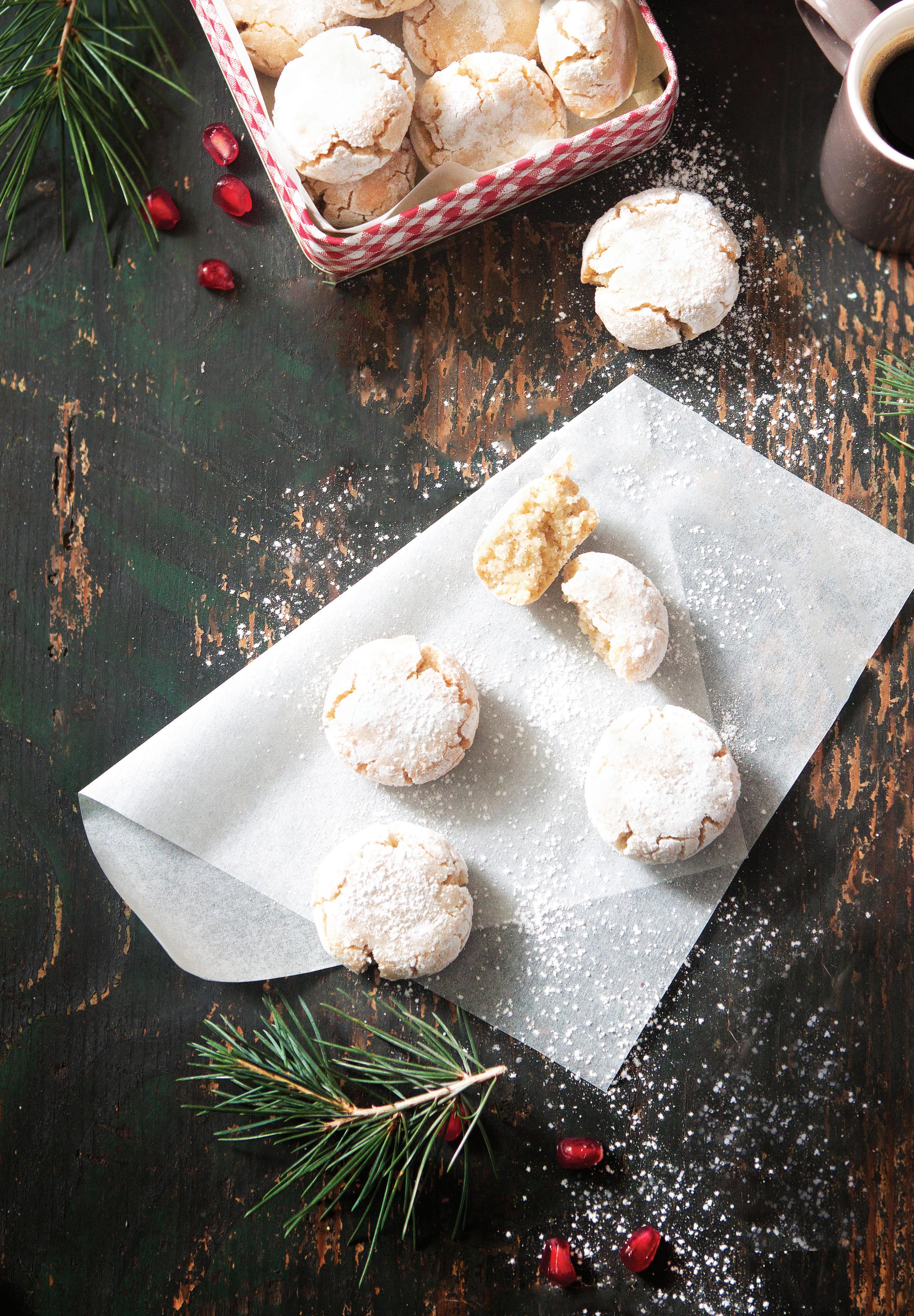Сплескват се леко с помощта на чаша с равно дъно. Пекат се в предварително загрята на 160 градуса фурна около 25 минути. Съхраняват се в плътно затворена кутия за бисквити. АМАРЕТИ 200 г бадемово брашно 90 г захар 1 пакет бурбонска ванилова захар, 10 г 2 белтъка щипка сол ¼ ч.л. бадемов екстракт 50-80 г пудра захар І ДЕКЕМВРИ 2022 76