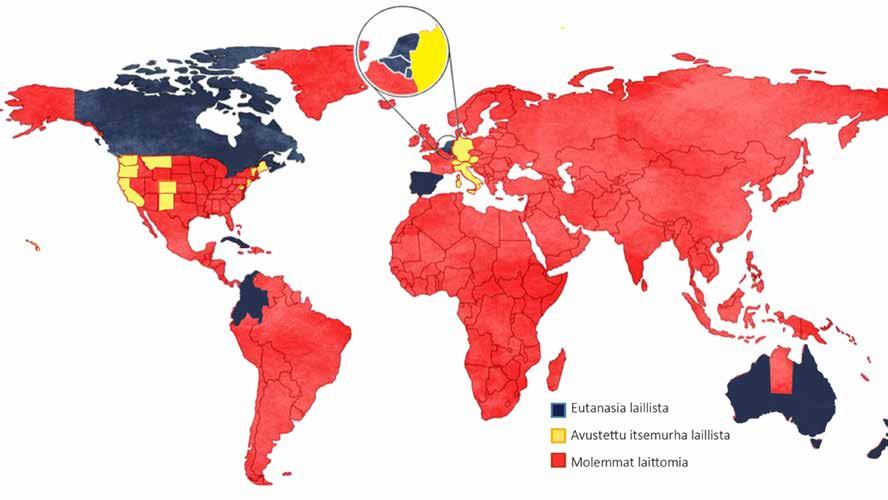 Kalle Mäen artikkeli tässä julkaisussa. Samaa kaltevaa pintaa kuvaa Kanadan avustetun itsemurhan lain muutokset, vuonna 2021 laki muuttui niin, että siitä poistettiin kuoleman uhan vaatimus perusteista, ja lisää muutoksia näihin yritetään saada jatkuvasti kaikissa maissa. Vähälle huomiolle on jäänyt, kun ihmiselämää aletaan arvottamaan kärsimyksen kautta, niin hyvin äkkiä paine kohdistuu ihmisryhmissä dementiaan sairastuneisiin ja vammaisiin, kuten on nähty kaikissa muissa maissa, joissa jotain höllennyksiä on tehty. Monet psyykkisesti sairastuneet ovat tyypillisesti näiden jälkeen seuraavia ihmisryhmiä. Siksi portteja ei saa edes raottaa, sillä lopputulos on niin moneen kertaan jo todistettu käytännössä.