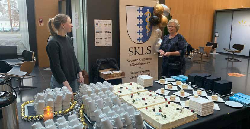 Lounasaikaan 27.11.2024 katettiin SKLS:lle näyttävä synttärikakkupöytä, lääketieteellisen tiedekunnan pääaulaan, ruokalan viereen. Herkulliset SKLS-logolla varustetut Hyväkakun palaset maistuivat kahvin kera, lounaan päälle. Muutamia Henkireikäläisiä oli apuna ja he kävivät valistamassa ruokailijoita, että ilmainen jälkiruoka oli tiedossa. Monelle saimme vakuuttaa, että kakut ovat juuri sinulle, kun yleensä aulan tapahtumat ovat suljetusti tietylle vierasjoukolle. Seuran esitteitä, jotka oli varustettu Joh 3:16 ilosanomalla, lähti kahvittelijoiden mukaan.