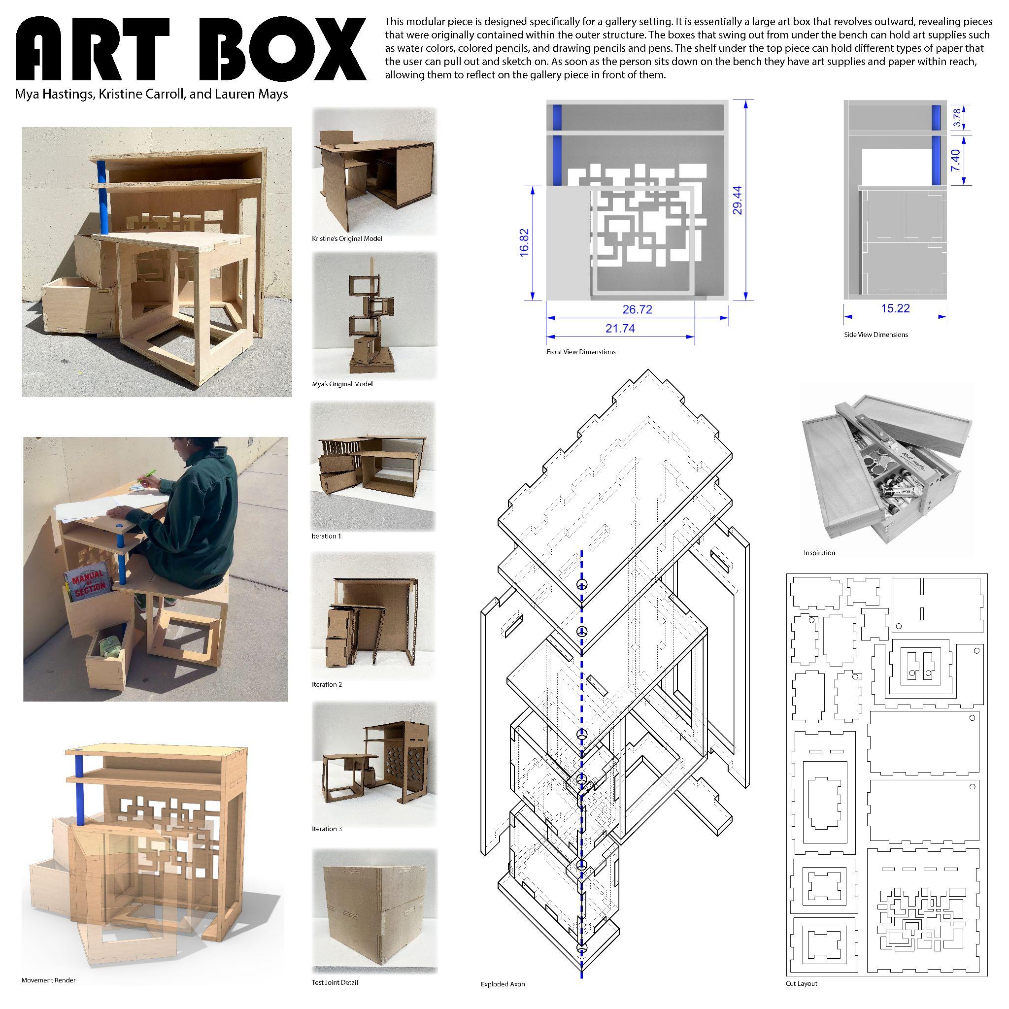 This piece, titled Art Box, is intended to be placed within an art gallery with its primary purpose as a multifunctional sketching desk. Each element rotates around the main blue axis located on the far left side. Each part is strategically placed on a 4’x8’ piece of plywood. Using the interior of different elements we were able to make use of every area within the sheet. Leaving room for ¾” bone joints on every side caused for a unique layout.