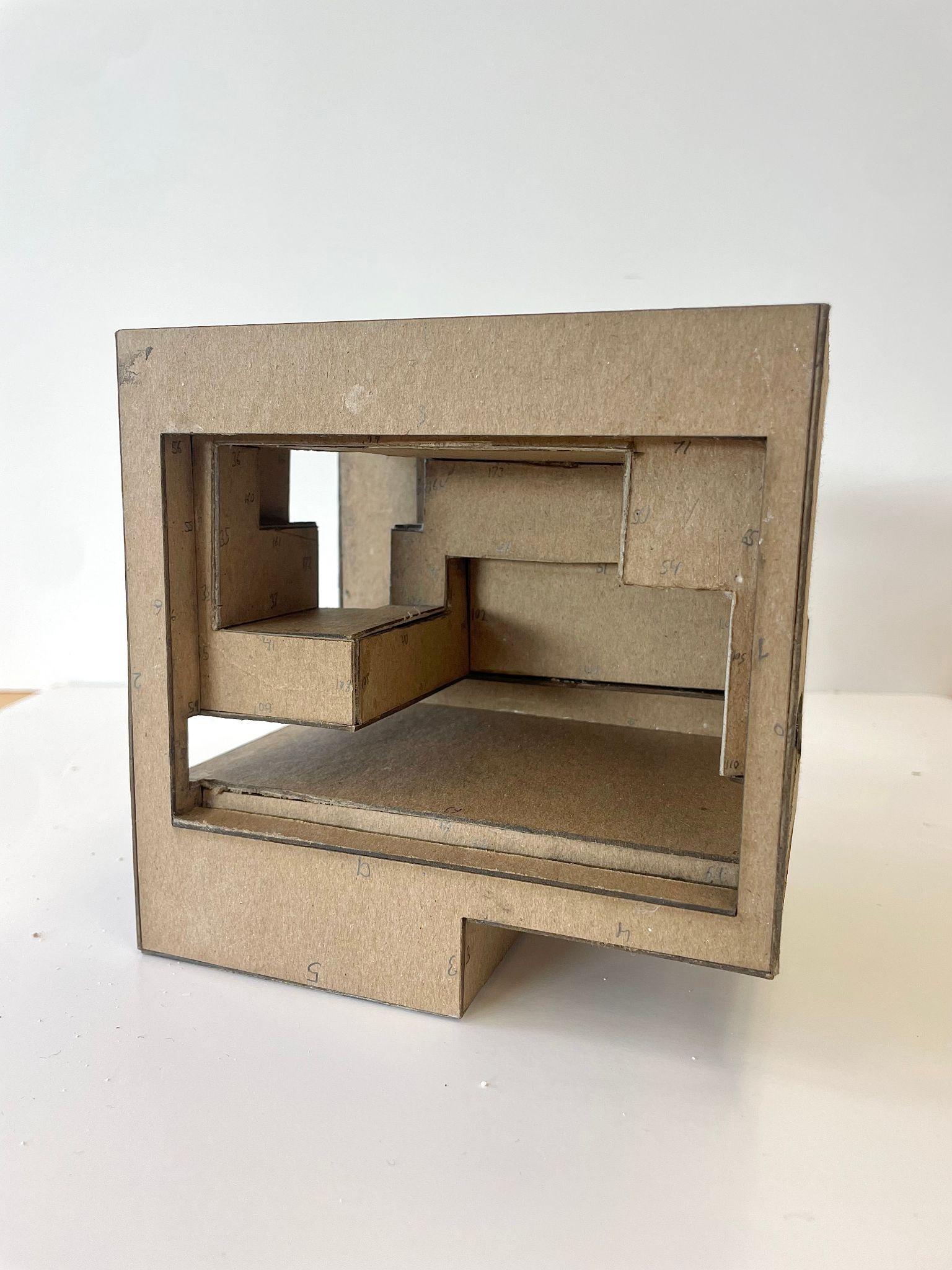 Using the folding method, I designed a cube that was more focused on the interior space. Using rectangles and cubes of various sizes, I created cuts that would form a complex space similar to that of a cave. With different openings on every side, the folding method allowed for a multipurpose structure that can be configured in many different ways .