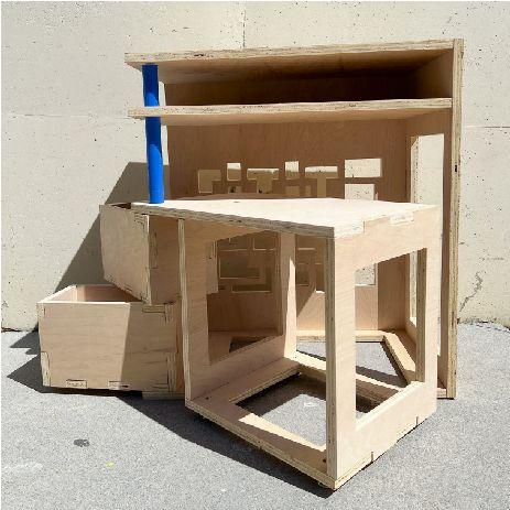 Assume the piece shall be placed in a gallery setting- either as a seating surface or as a display surface [or both]. Must be designed to fit on one 4’x8’ sheet of ¾” plywood. All joints must fit together structurally without the use of glue or adhesive. Only Materials available for use in final construction is the single sheet of plywood.