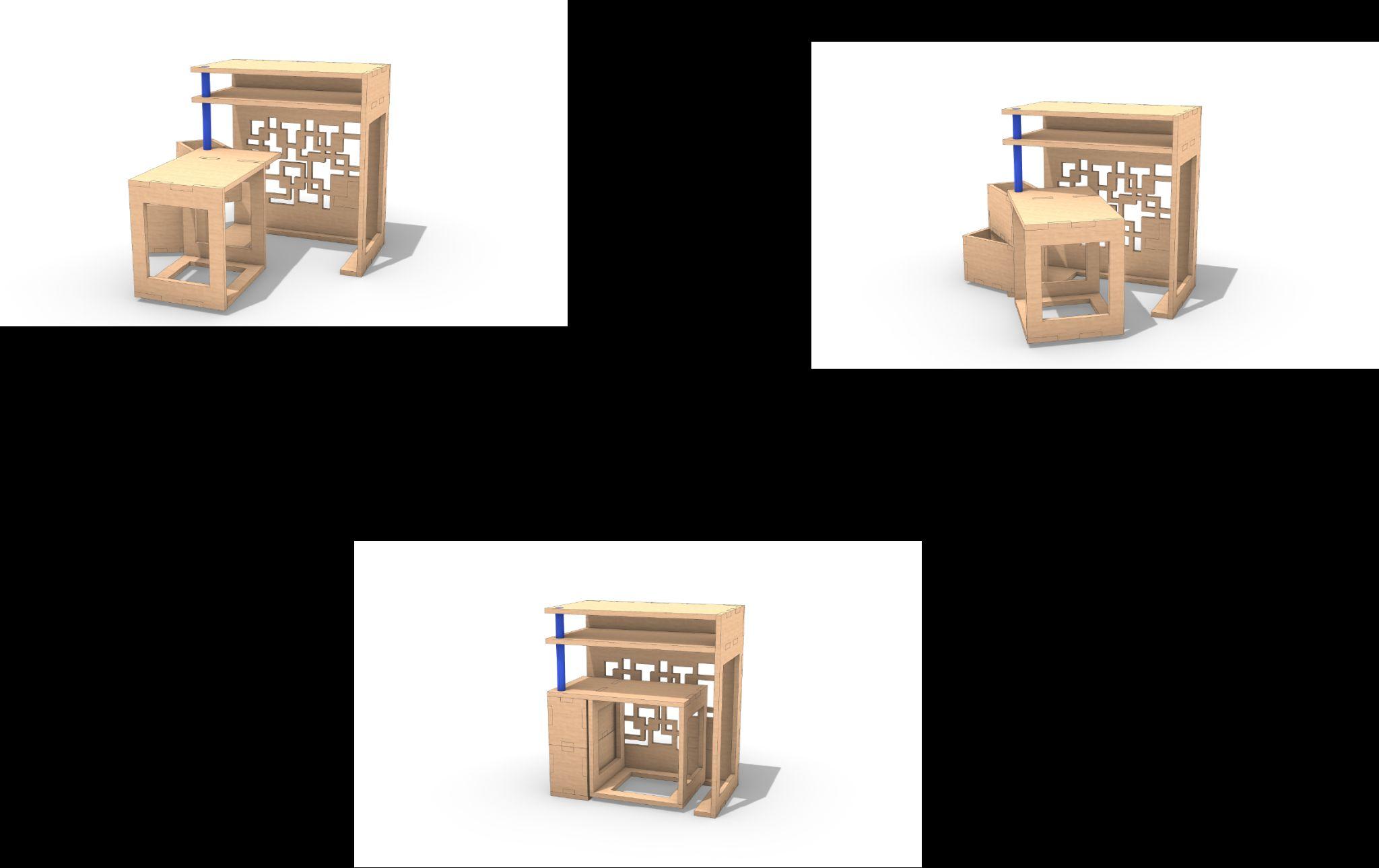 The Rhino model was crucial to develop dimensions that fit the standard size for both desk and chair height. Through multiple iterations, we were able to calculate the proper proportions without restrictions of the outermost structure. All elements within the desk can pivot freely around the axis.