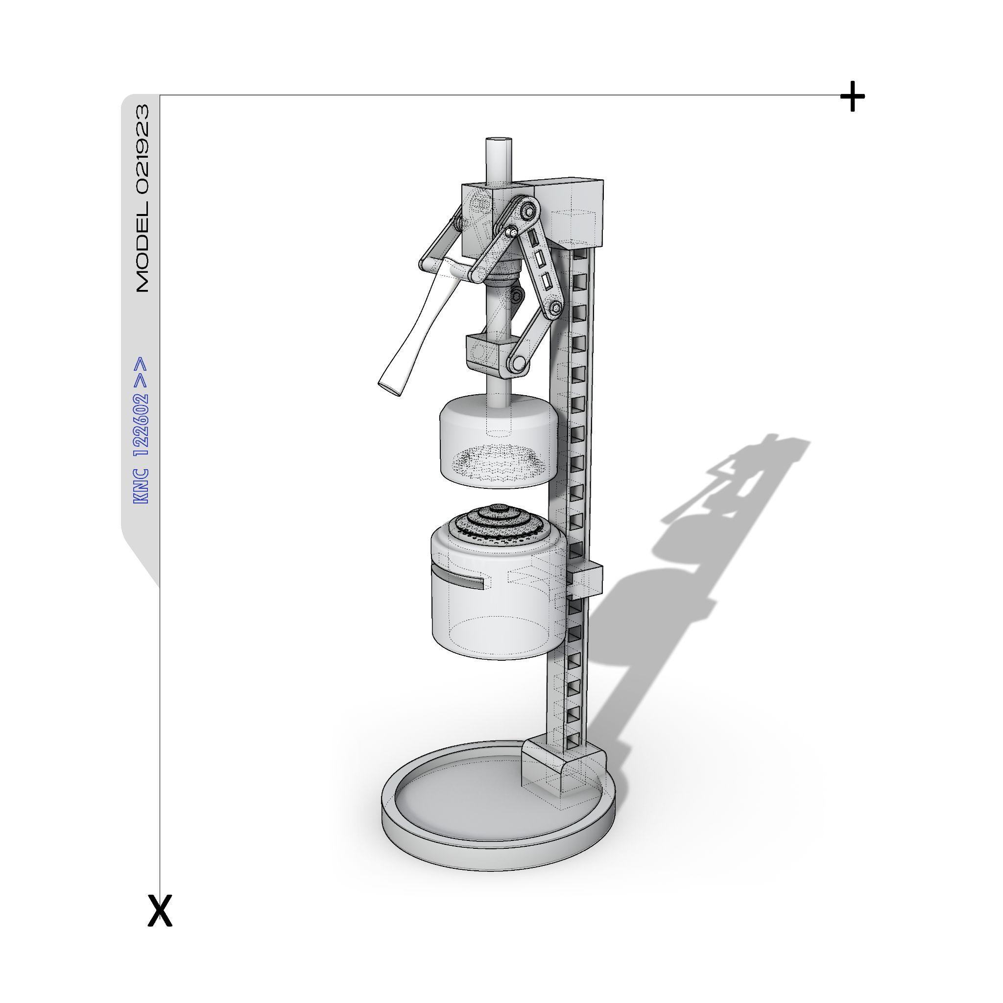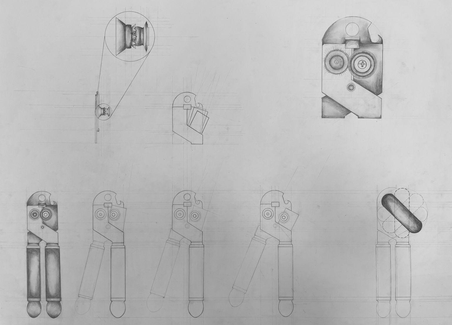 Prompt: Choose an industrial object that suggests manual movement. Document the interaction of its parts through a sequence of movement. Using a 1 to 1 scale, draft drawings that closely examine the elements with various line weights and shading.