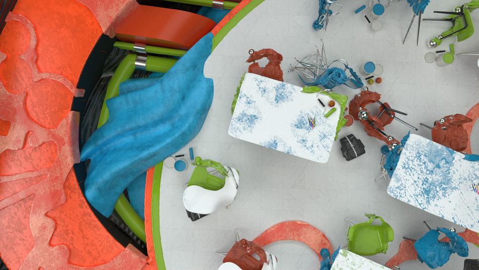The classroom animation takes the form of a top view ‘Powers of 10’ sequence. At its closest the frame shows the details of the classroom furniture and the tools that the students might use to express their individuality. As the camera pulls out you begin to see the classroom grow. The way you circulate between spaces highlighed in a bright red. At the widest angle you can see the full view of the classroom. The stage like presentation platform at the front. Multiple levels of student space and a ball pit to the back of the classroom for recess.