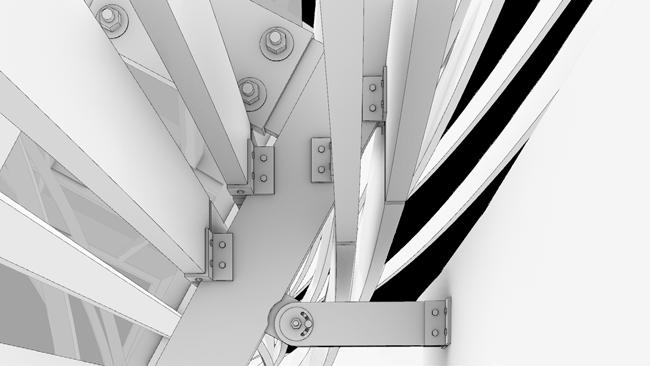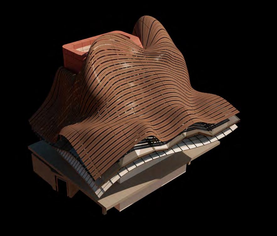 We modified the design of the Darling Exchange by attempting to move the point of enclosure to the facade itself. We created a monolithic expression of the nested wood wrapping and created variation on the facade through the mountain and valley folds of the primary tapered steel members. We designed the joints and connection with the construction of the facade in mind. The facade is tied back to the original geometry of the slab edge. The IGU wall sits inset from the steel structure establishing the point of enclosure at the facade differing from the original Darling Exchange. As the facade reaches the green roof a double IGU parapet detail is employed to provide the supplemental natural ventilation. The clear parapet is utilized to maintain consistent transparency behind the accoya wood wrapping. This creates a monolithic impression of “nesting” bands which hug and bind the building all the way around.