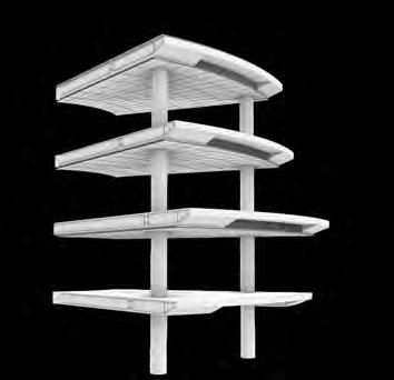 The system works in levels where each level houses its own sustaining blue carbon enviroment centered around the mangrove tree. The trees grow continually under the purple glow of lighting systems above. Water and sediment are pumped in water towers between wall segments that service each level with fresh ocean water and sediment. Sediment is key to carbon sequestration because the soil holds approximately 70% of the carbon within blue carbon enviroments.
